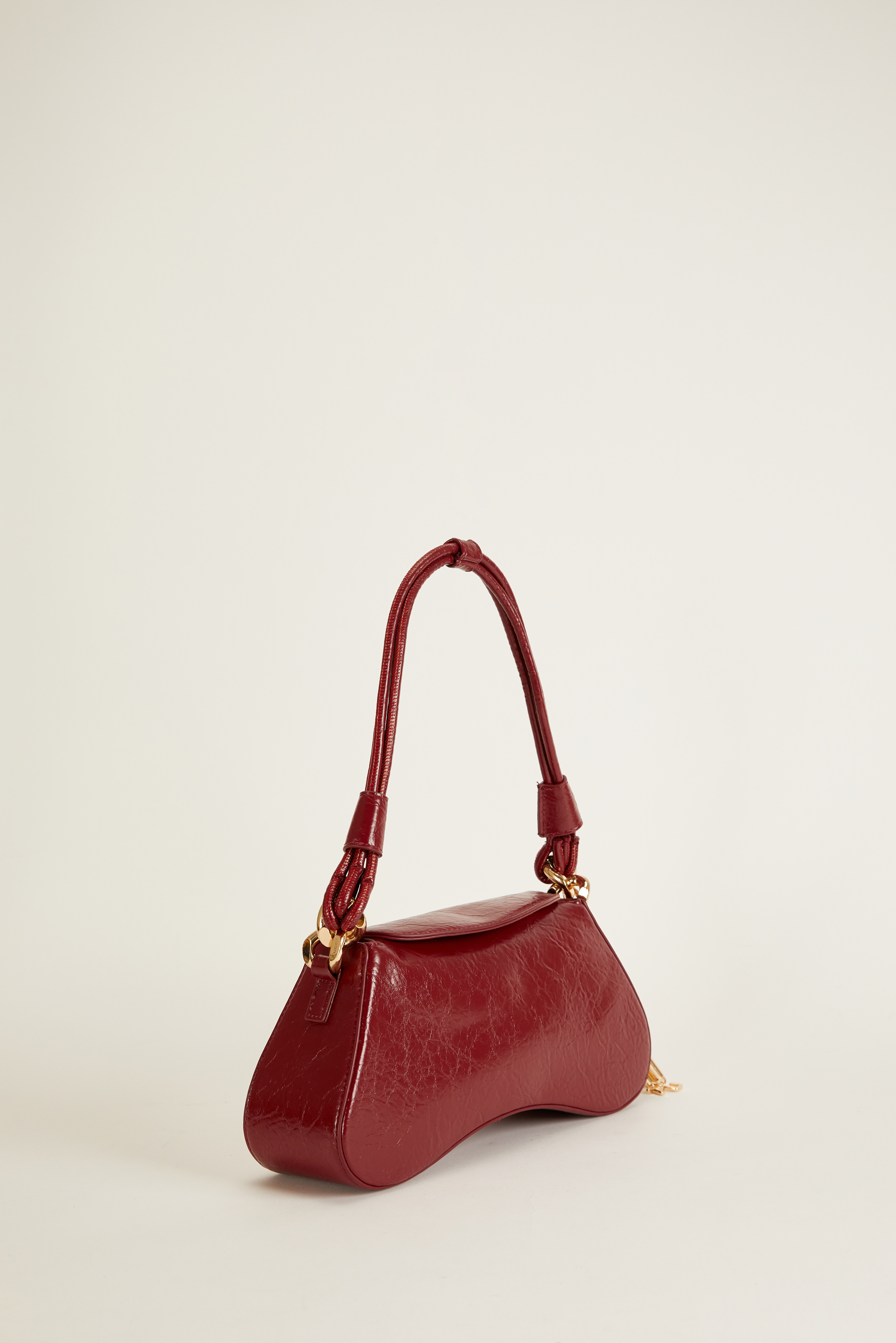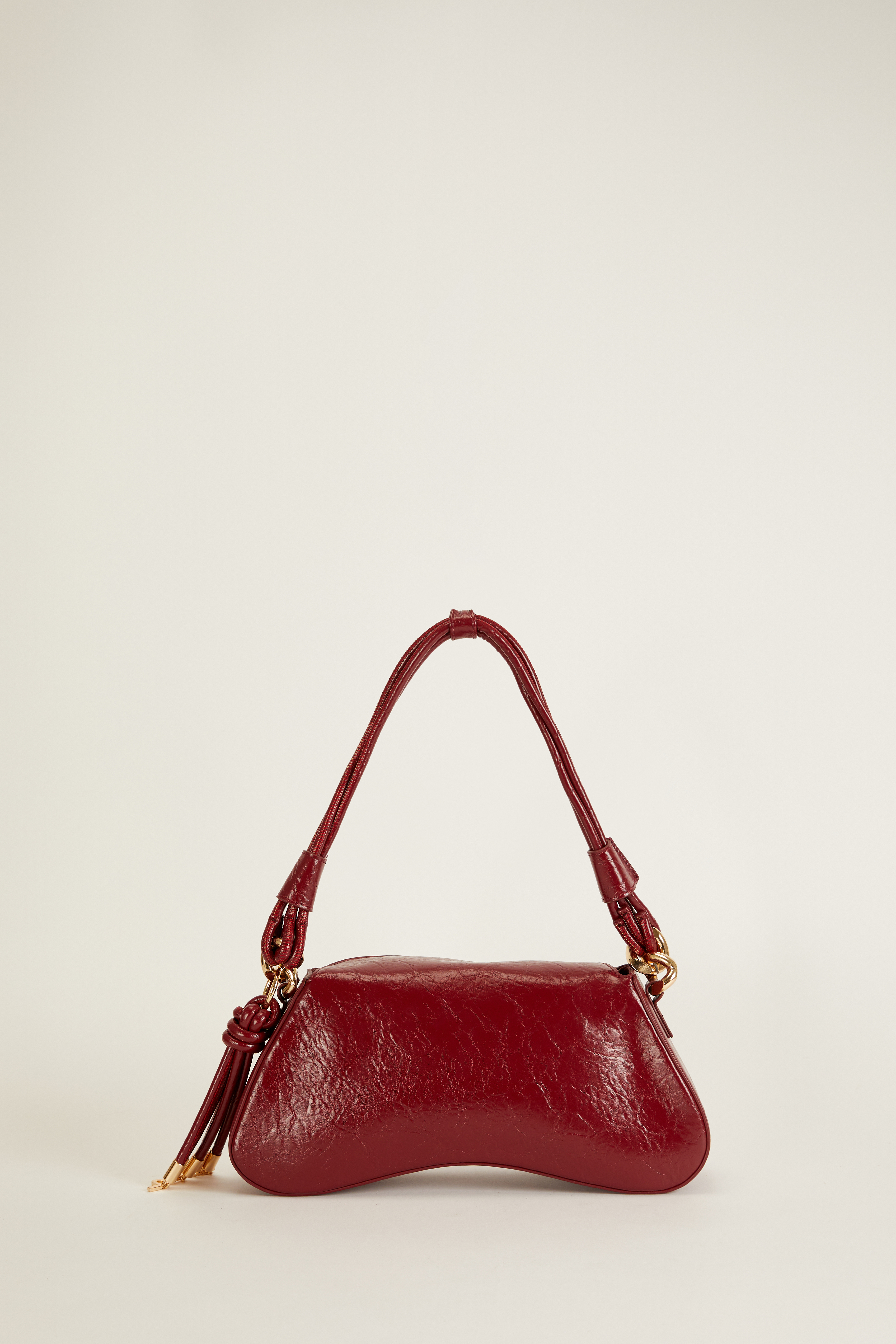 Cartera mediana con forma distintiva confeccionada en cuero ecológico. Tiene correa regulable para usar de distintas maneras. El interior está forrado. El cierre es dede arriba con imanes. Lleva un llavero con tiras que es desmontable.
