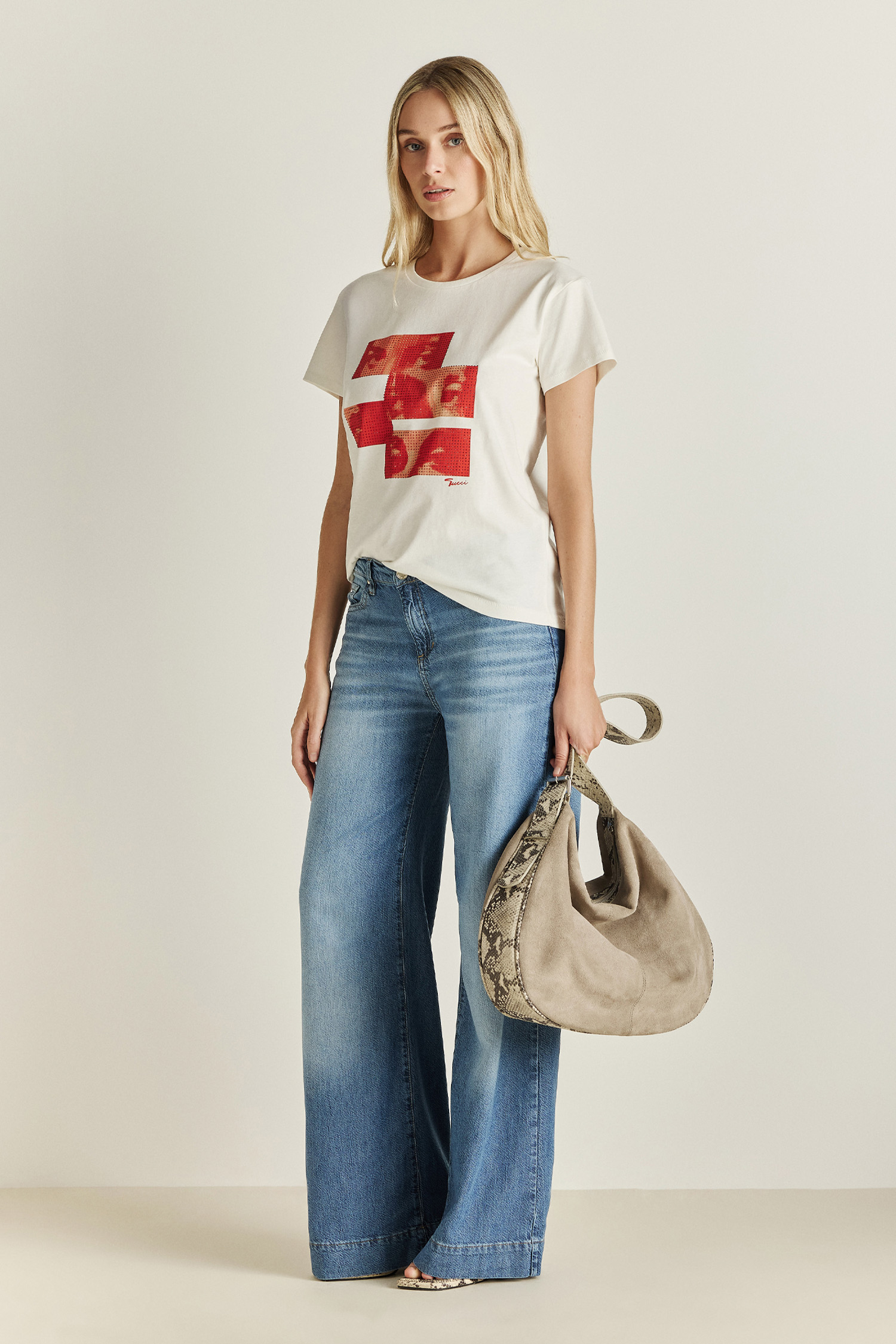 Esta remera manga corta aporta estilo y comodidad. Con una estampa fotográfica llena de brillos que eleva cualquier look casual.