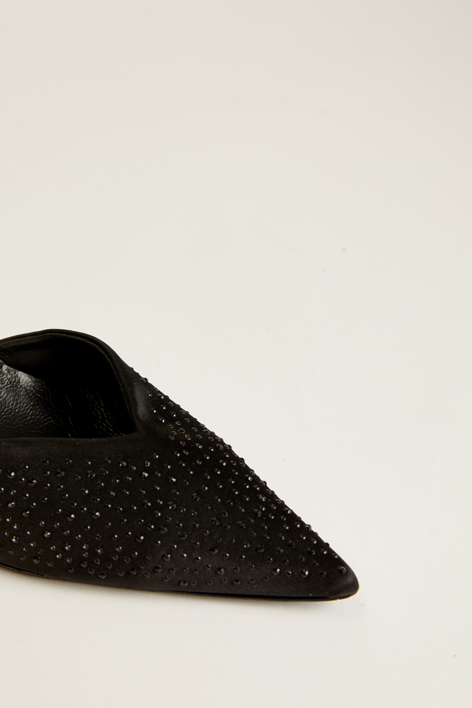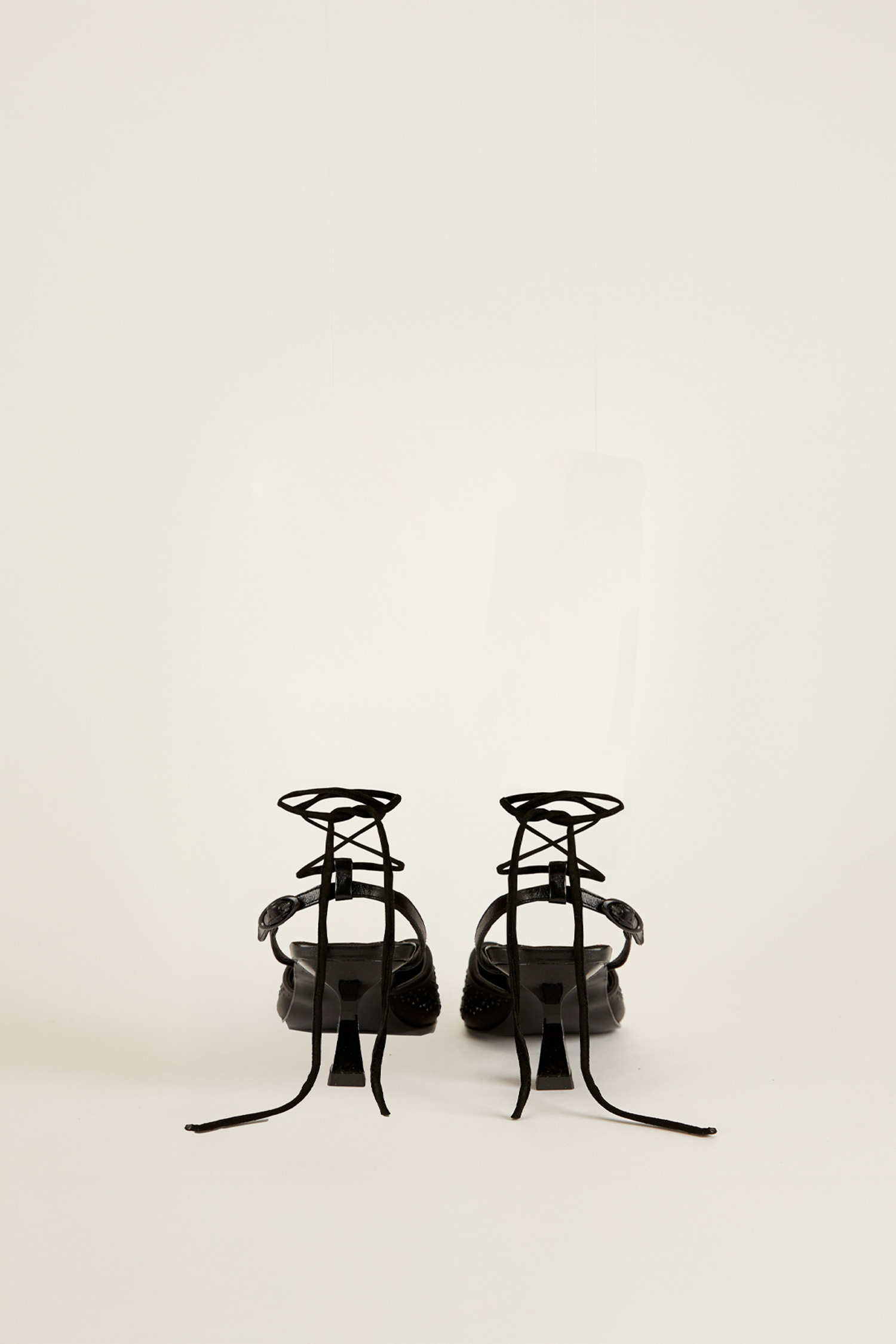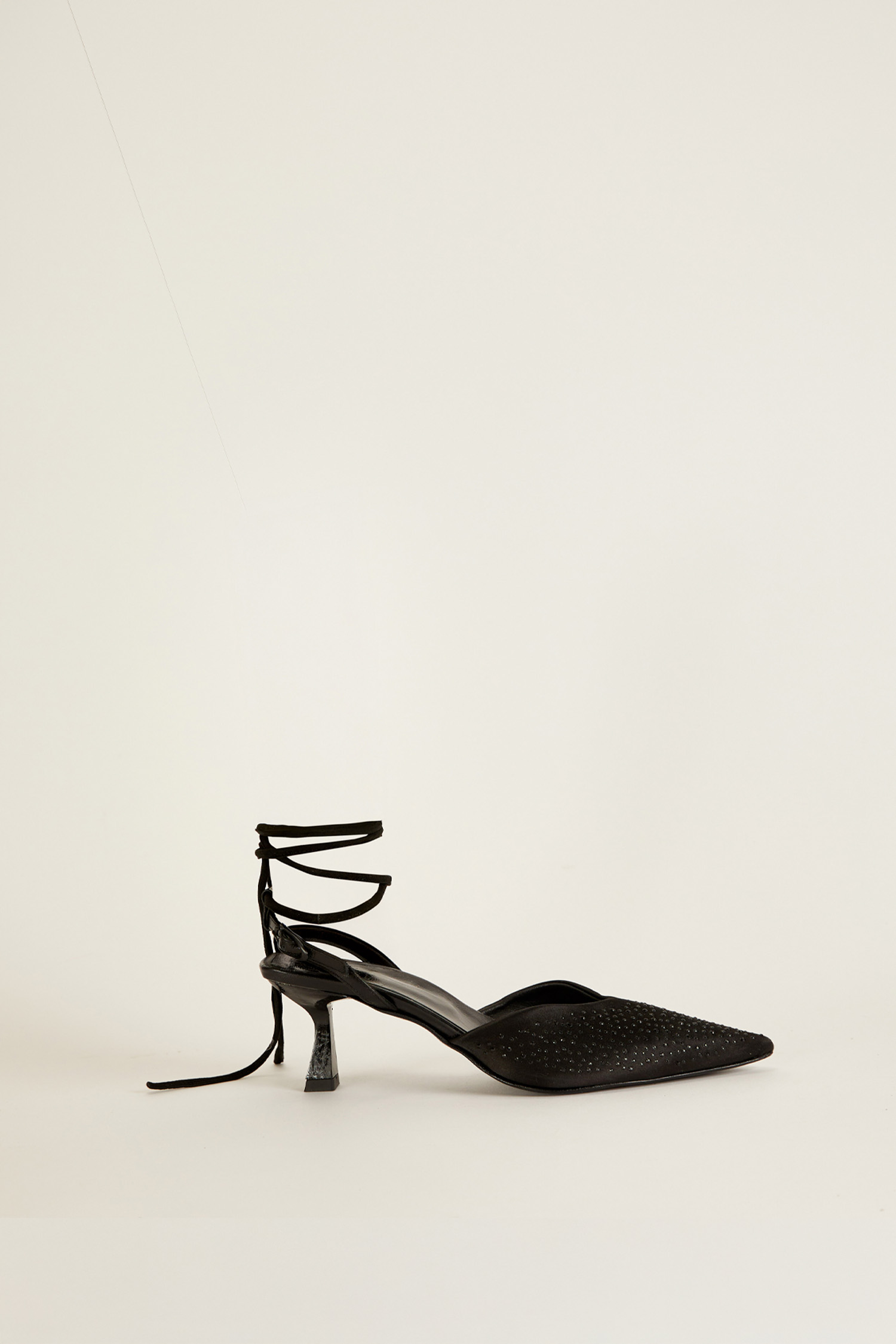Zapato confeccionado con un género satinado con diseño exclusivo de strass en la capellada. Lleva lazos de cuero para atar como más te guste, y un taco bajo que combina la sofisticación de un stiletto con la comodidad que necesitas para estar siempre elegante. Alto de taco de 4cm.