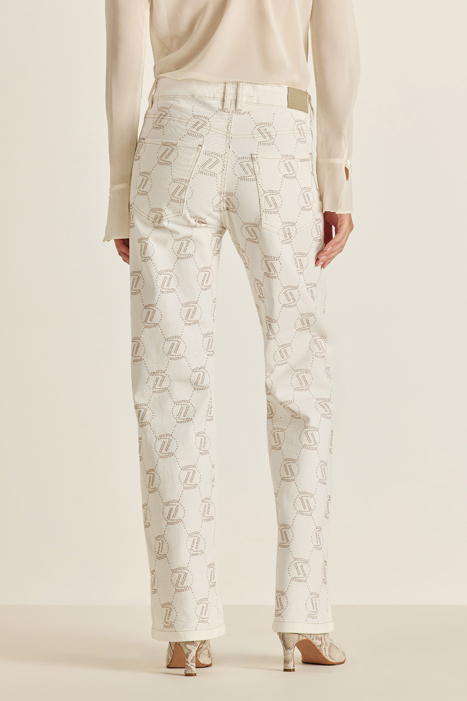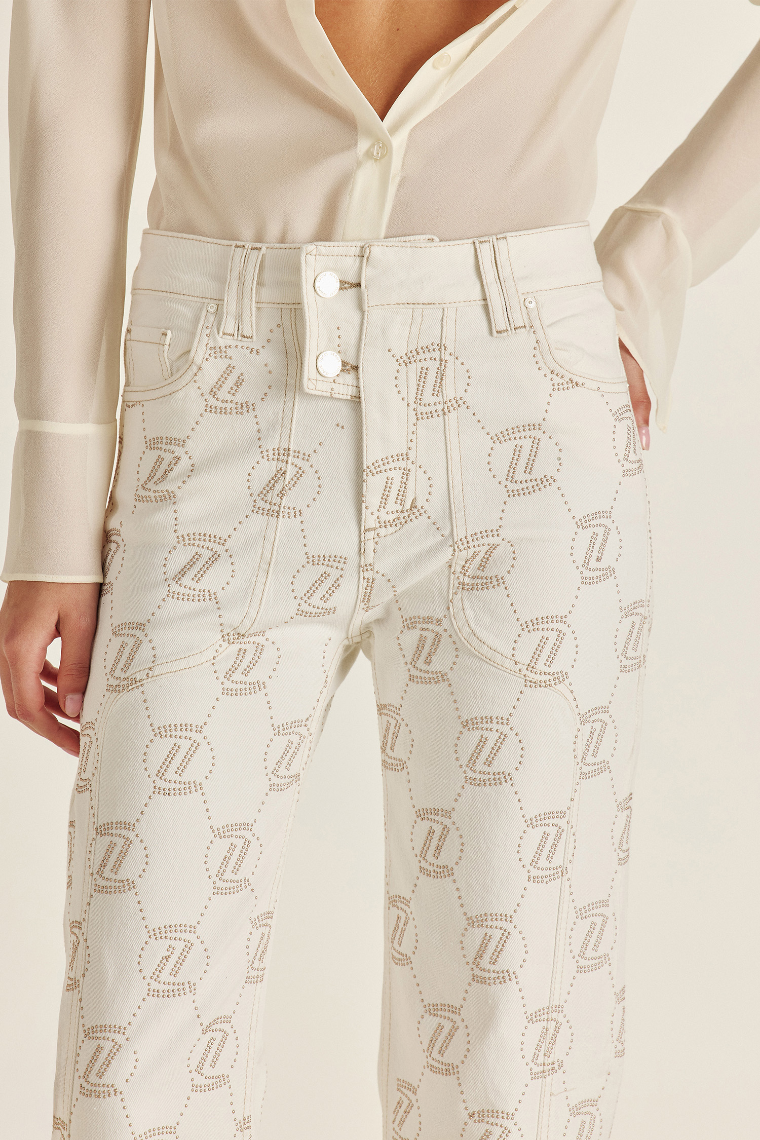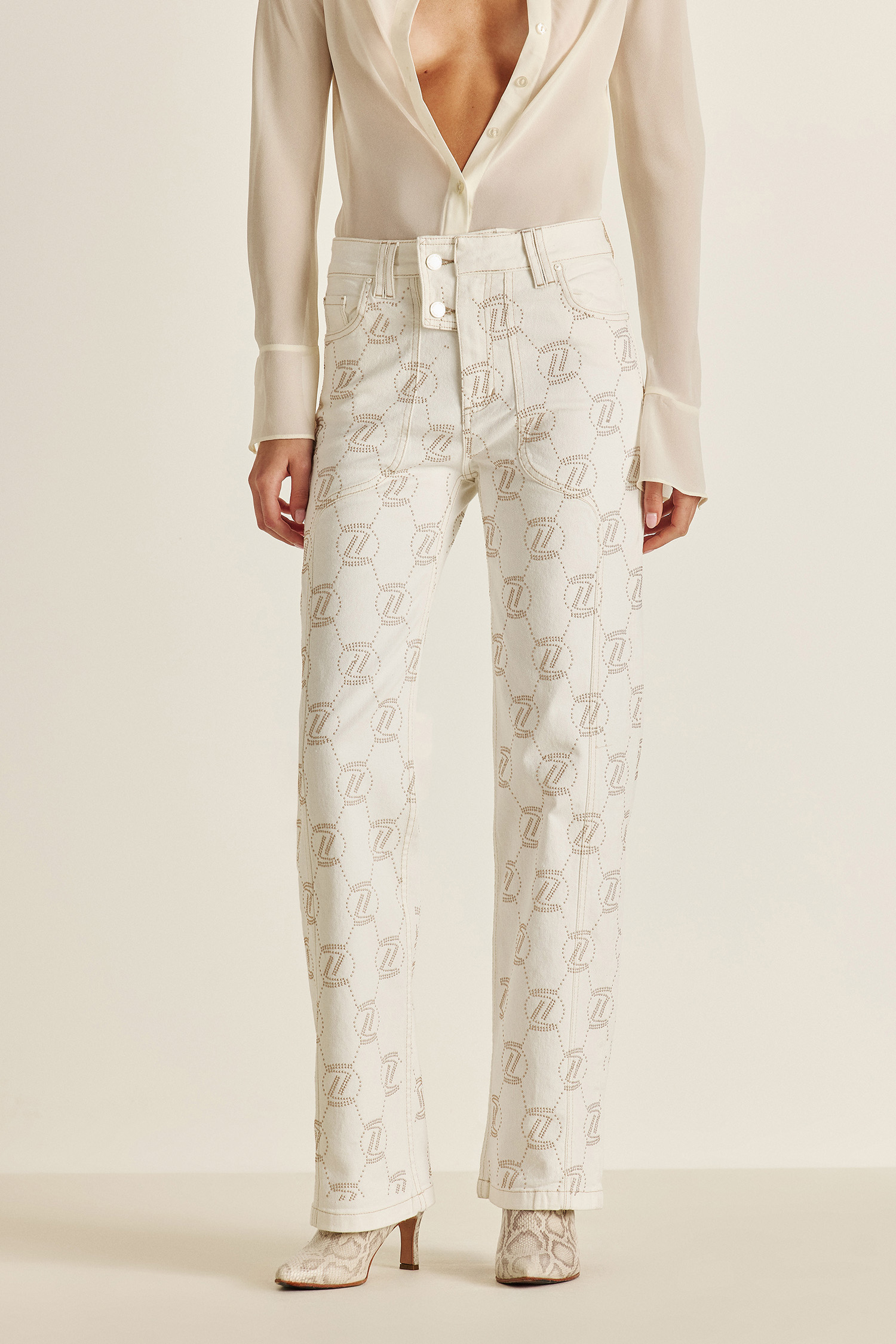 Pantalón de denim off white tiro alto fit recto confeccionado en tejido con stretch. Customizado full monogram con tachita bombé oro opaco. Combinalo con la Campera Fancy Iconic.