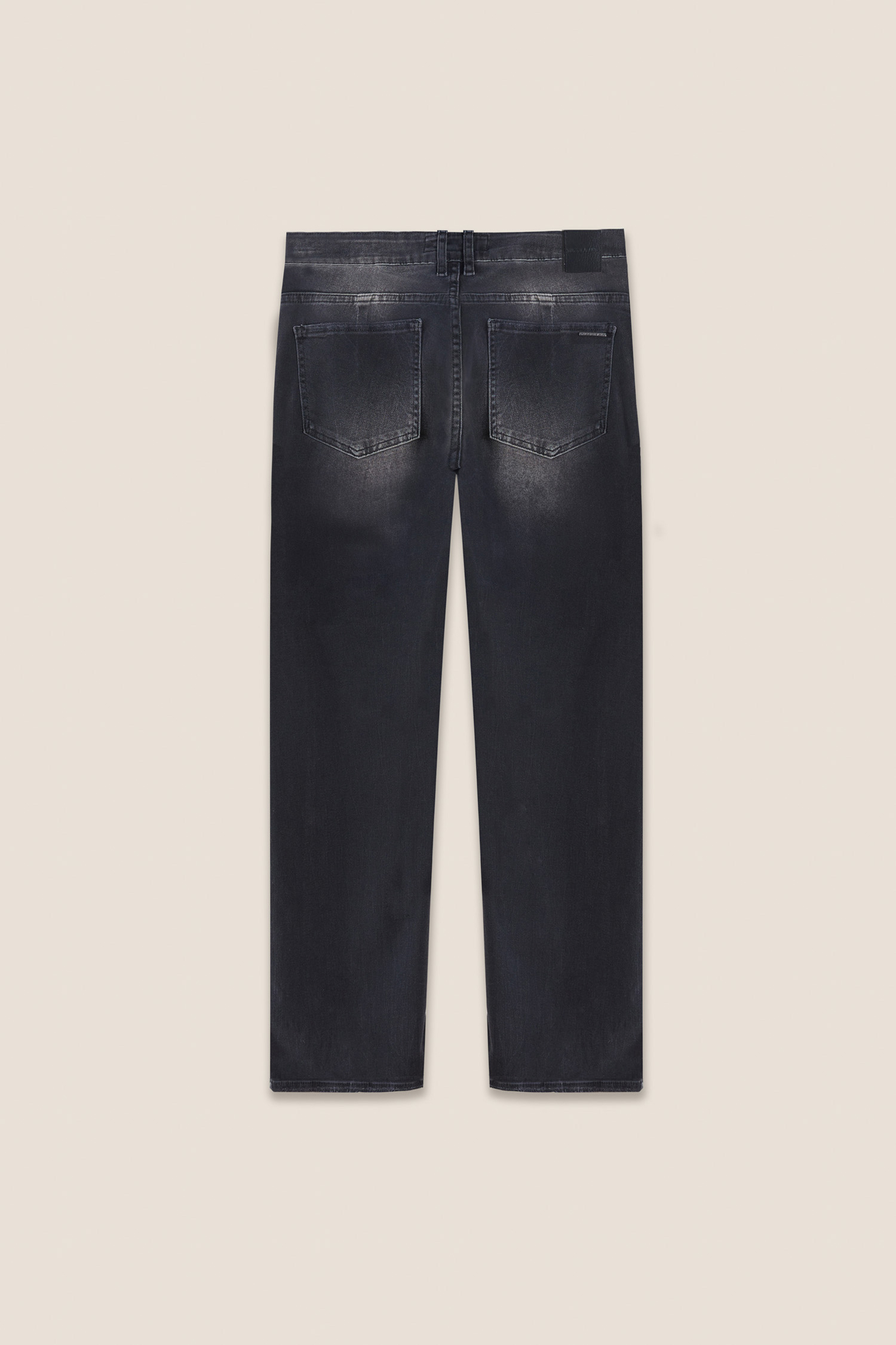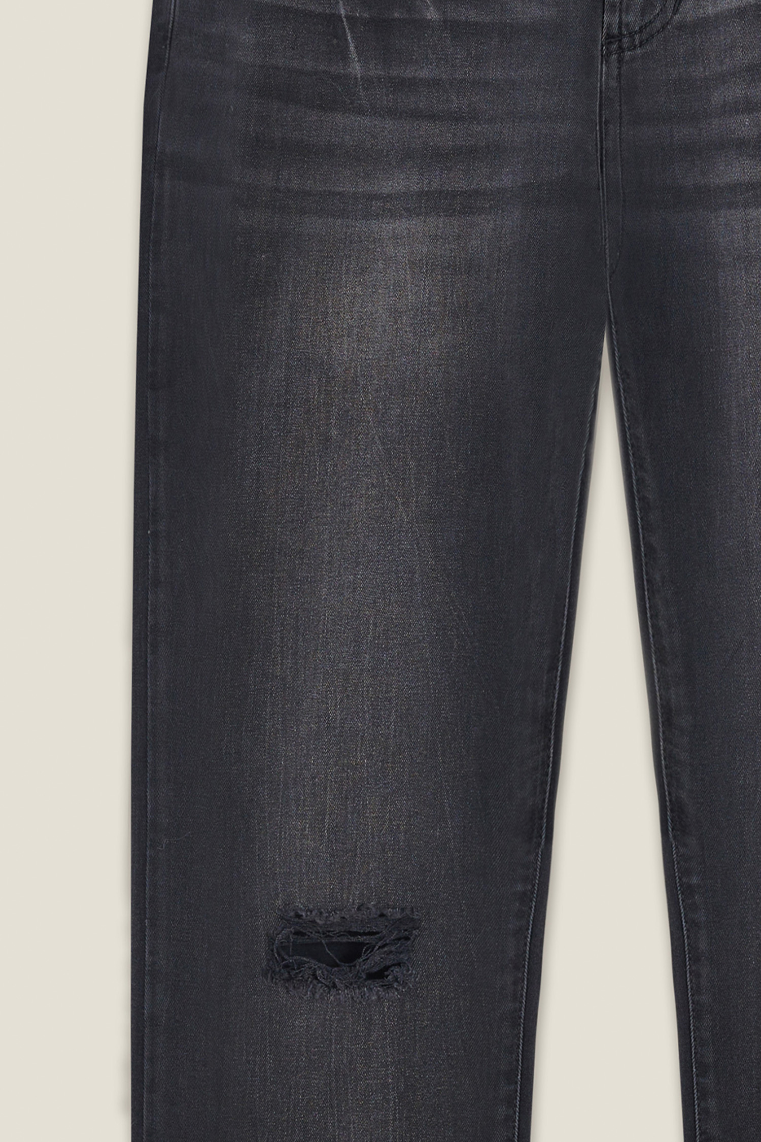 Pantalón de denim tiro bajo recto. Tejido super strech que aporta comfort. Detalle de tajo pequeño en entrepierna. Lavado negro envejecido con suaves iluminaciones. Perfecto para cualquier momento: usalo de día con un look relajado o de noche con un estilo más sofisticado. Botón, remaches y chapita exclusivos de la marca.