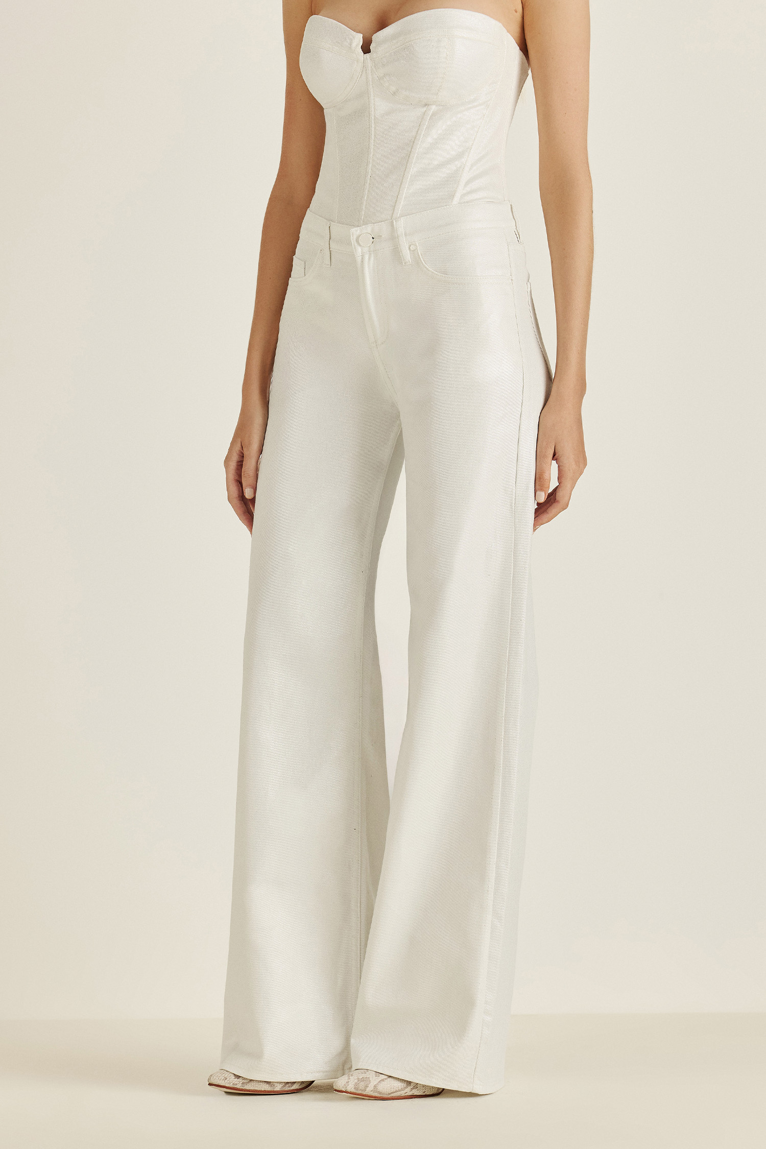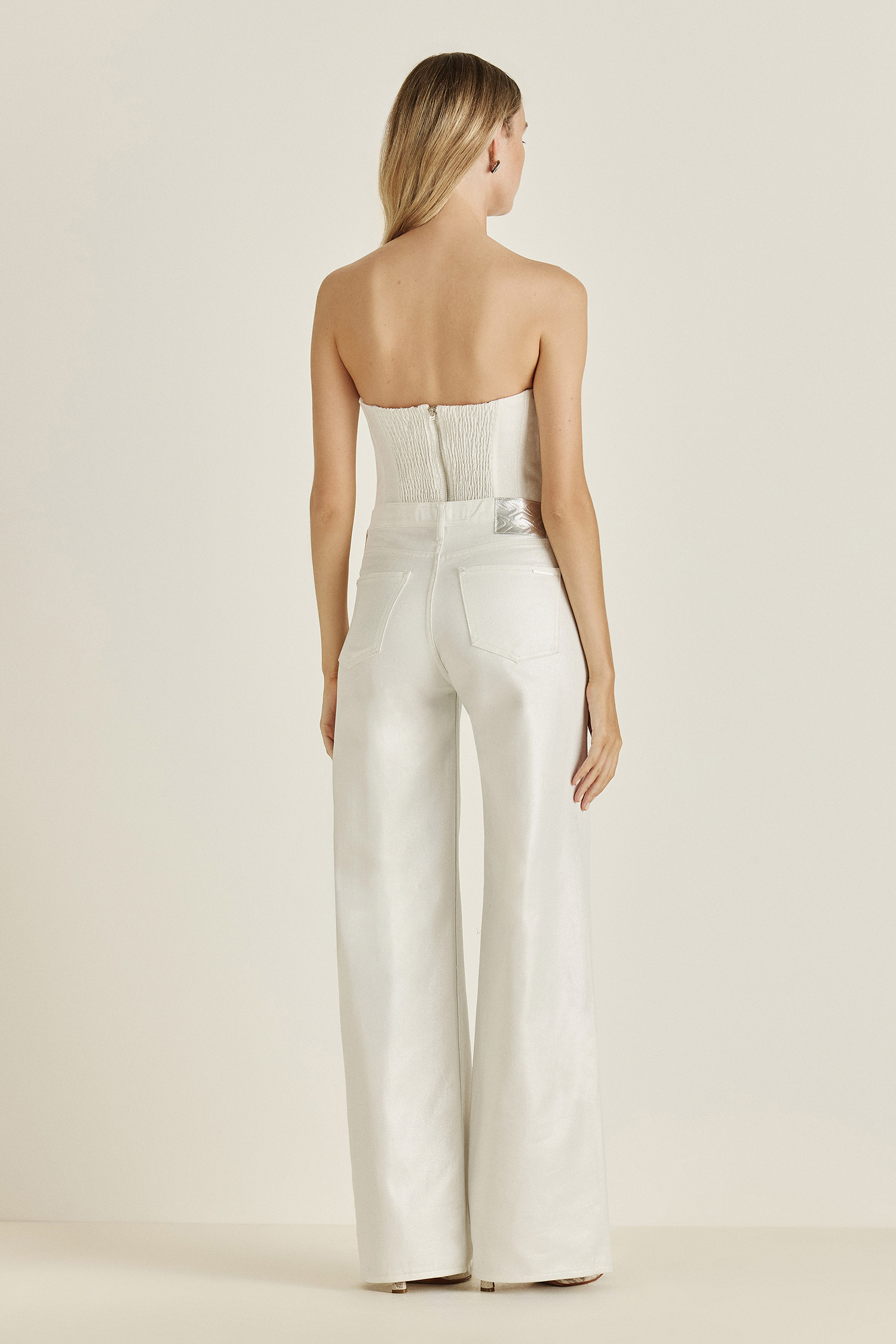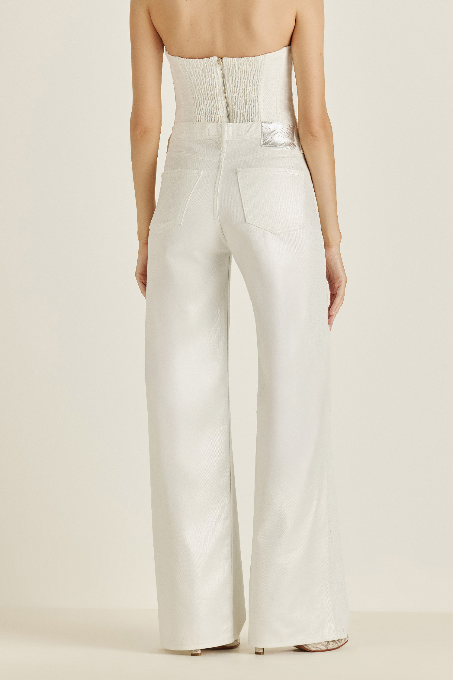 Pantalón wide leg, confeccionado en tejido 100% algodón. Tiene una textura generando un efecto luminoso ideal para la noche navideña Combínalo con el Top Starshine
