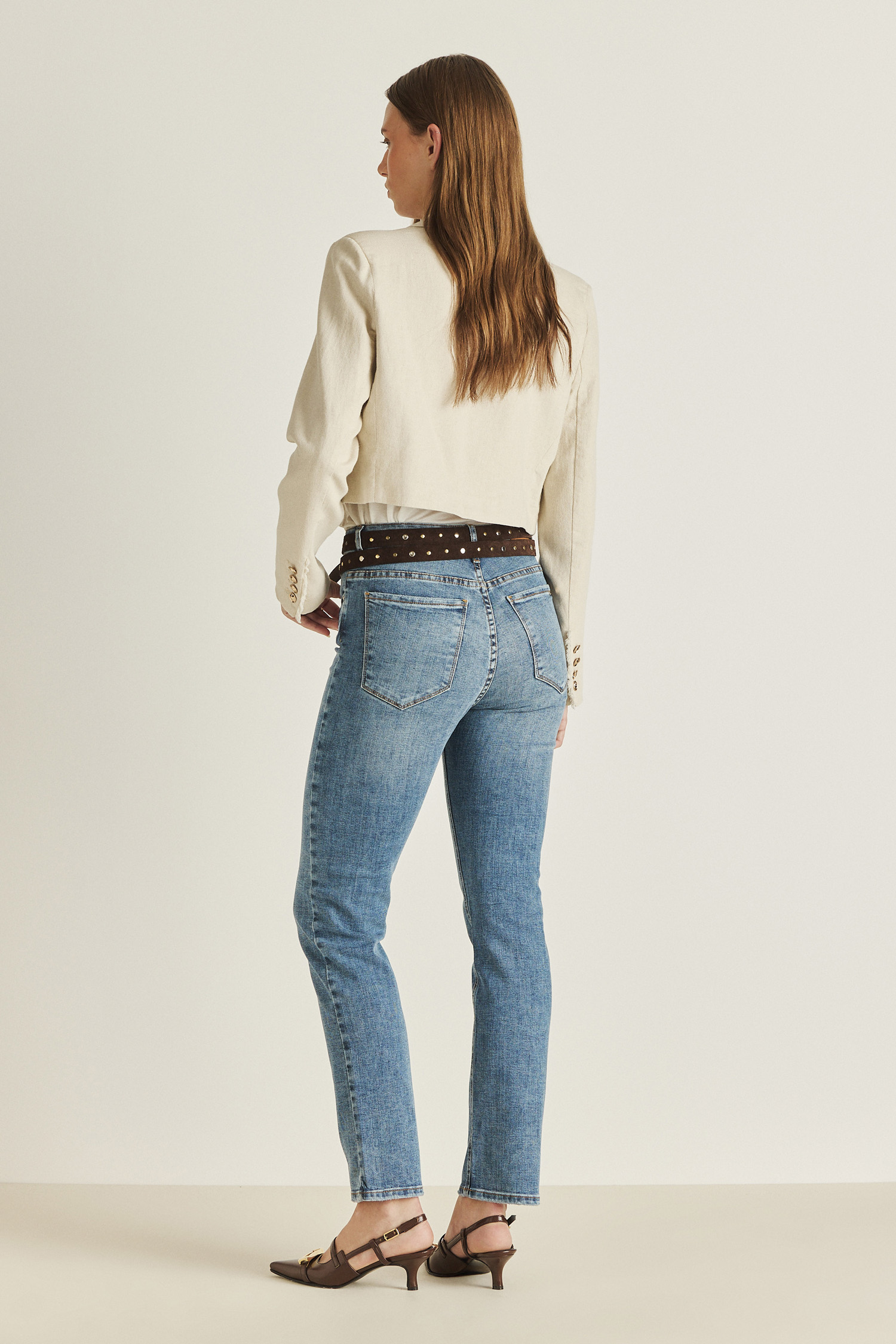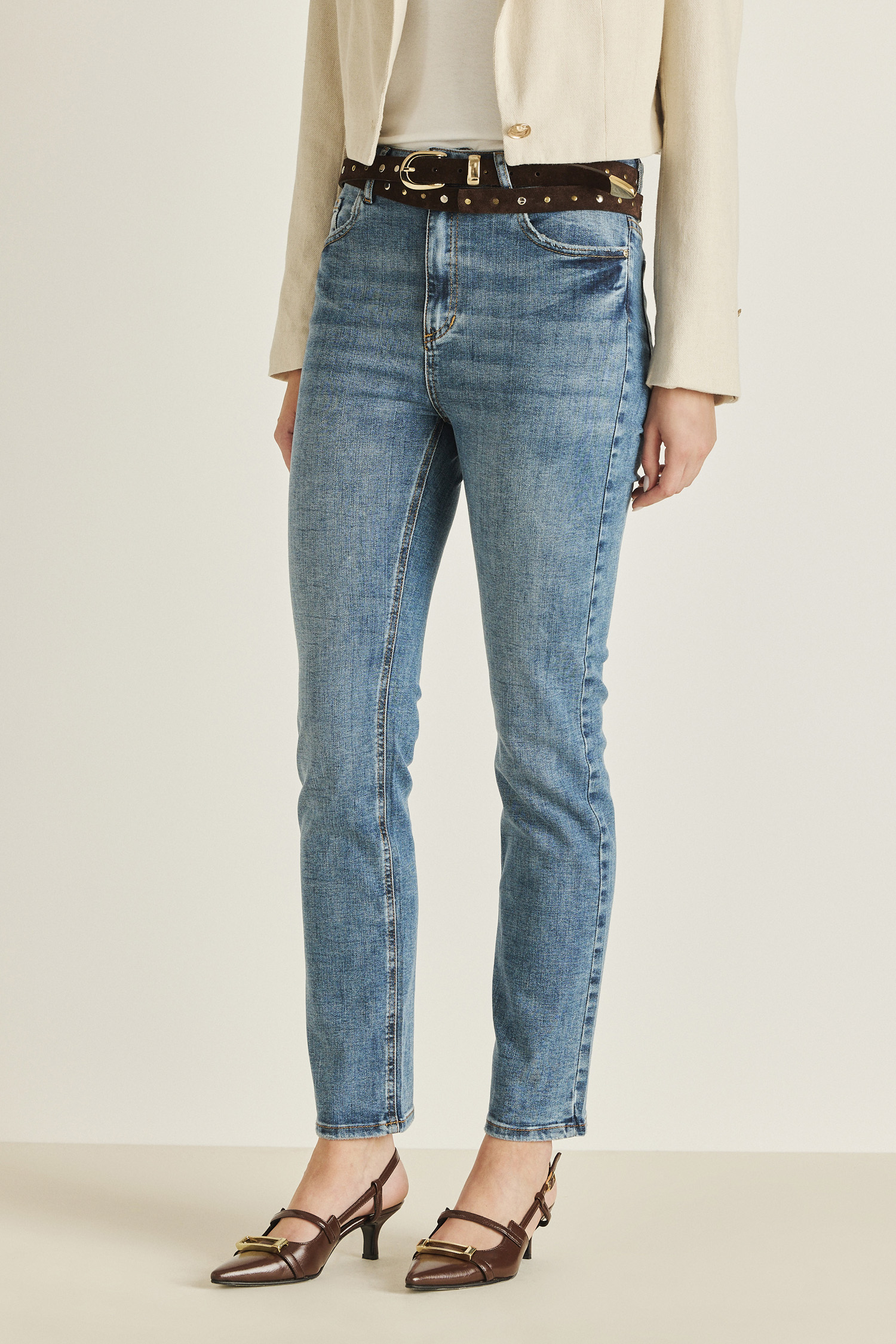 Pantalón de denim tiro alto fit skinny. Tejido premium importado con viscosa que aporta suavidad, microfibras de poliester que le dan estabilidad a la prenda, evitando que se estire y stretch que aporta comfort. Lavado indigo medio con suaves localizados e iluminaciones. Boton, remaches y chapita pulidos espejo exclusivos de la marca.