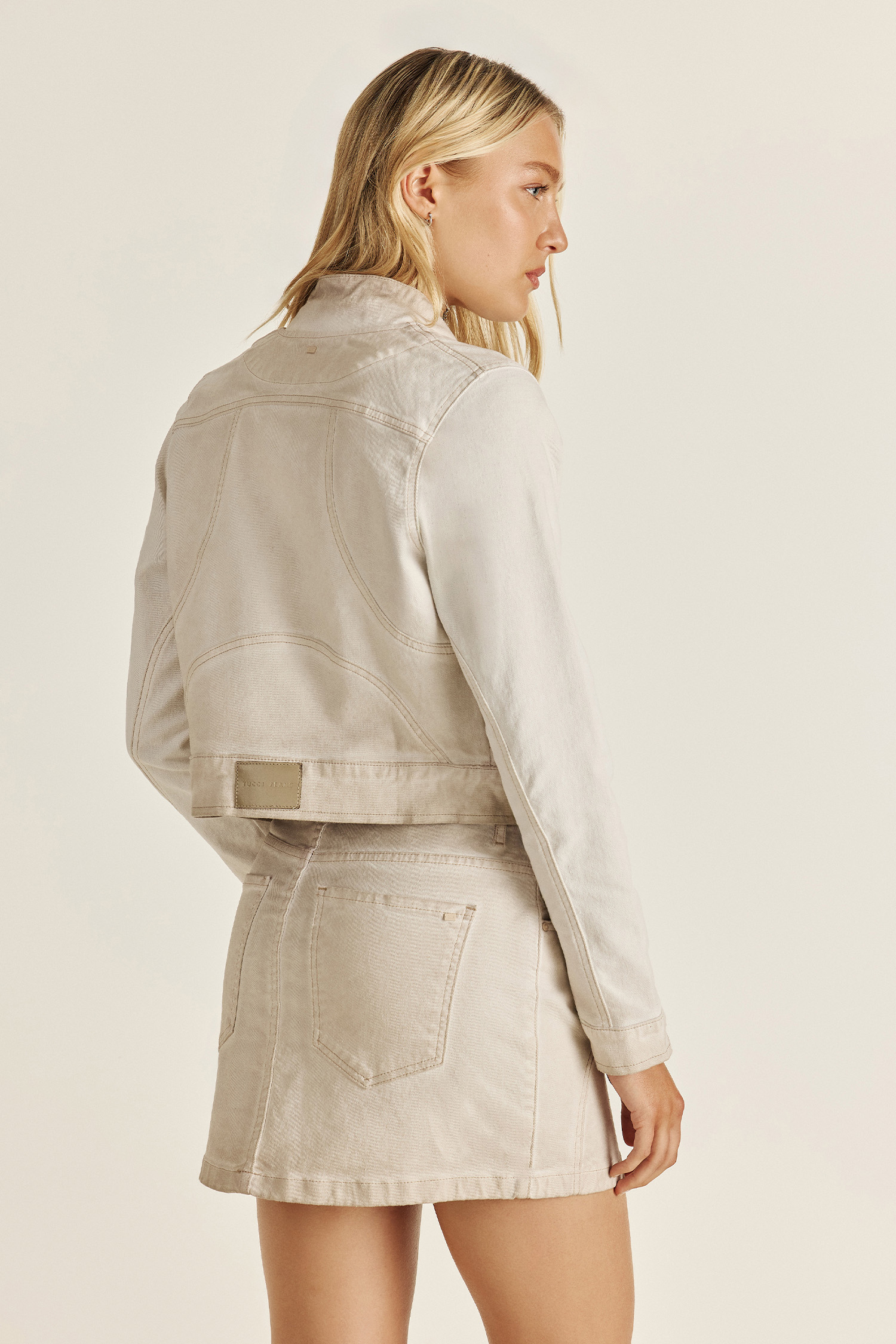 Campera de denim entallada con recortes en delantero y trasero confeccionada en tejido con stretch. Lavado super en tendencia off white con acabado dirty. Combinala con la Mini Fancy Dyed o el Pantalón Fancy Dyed.