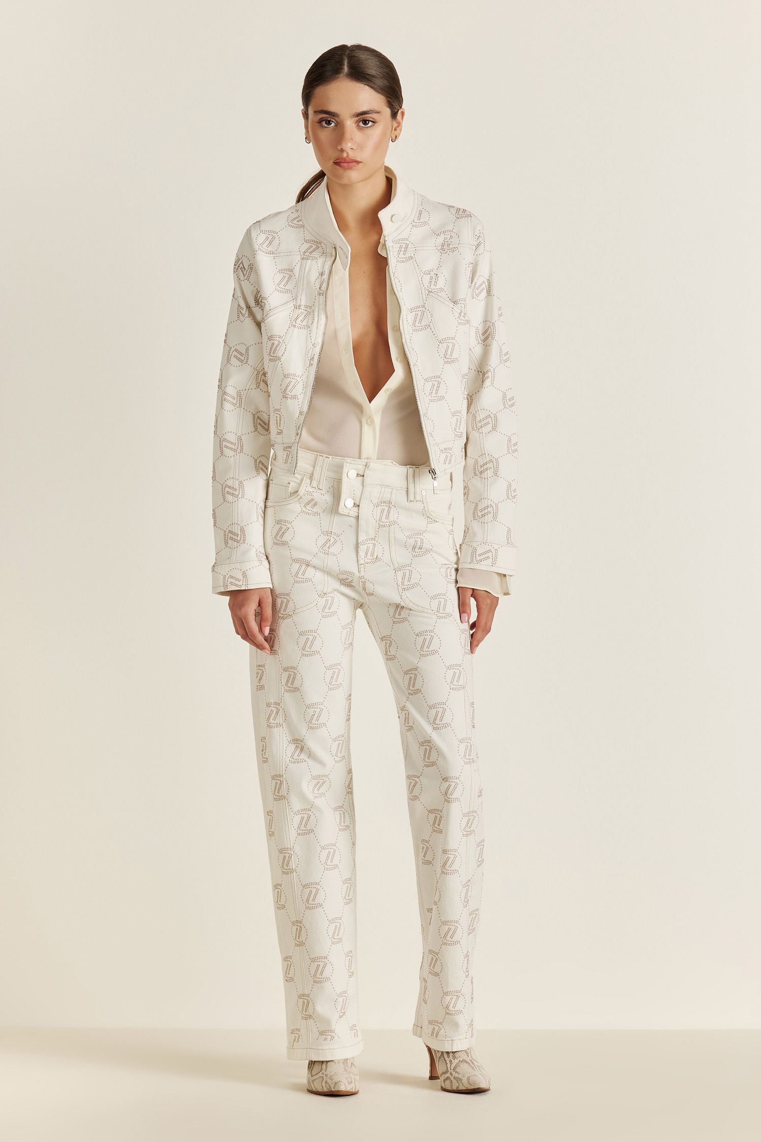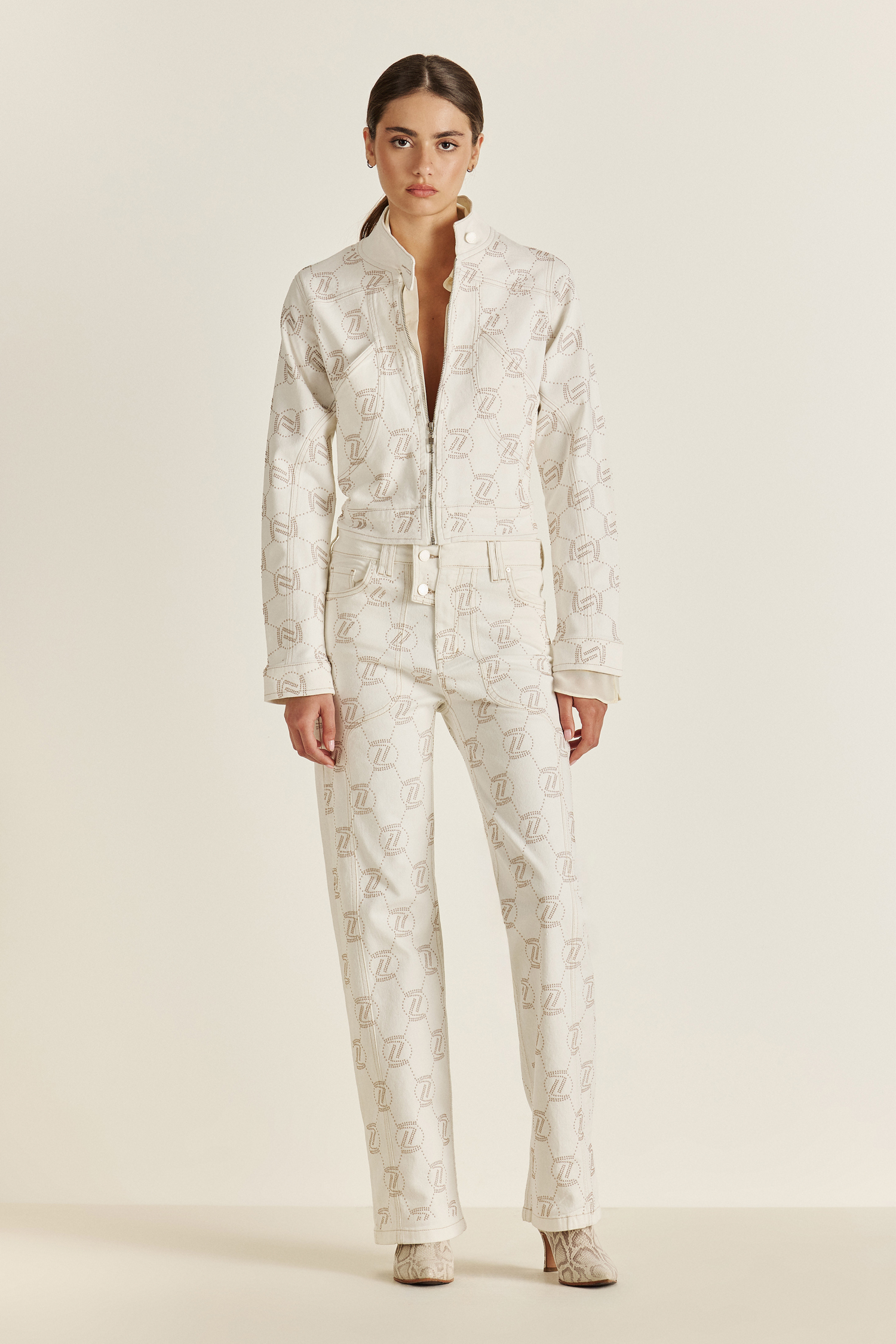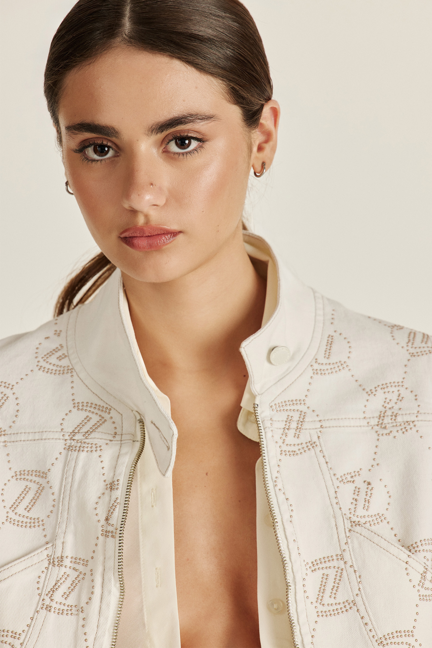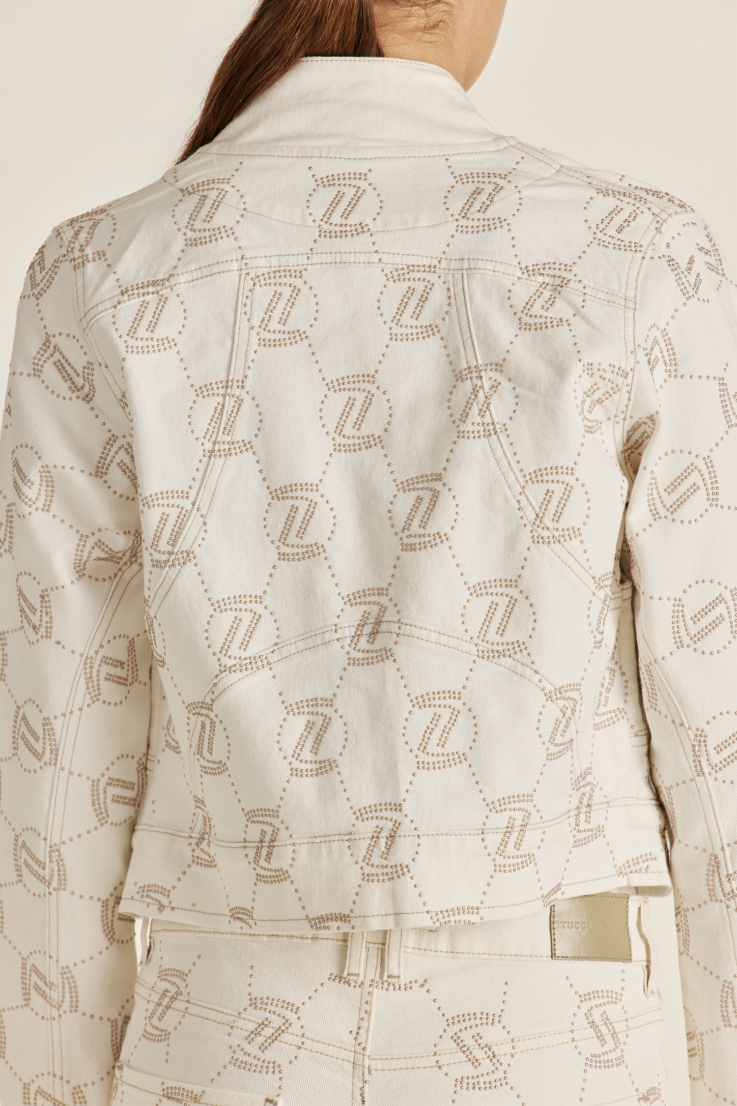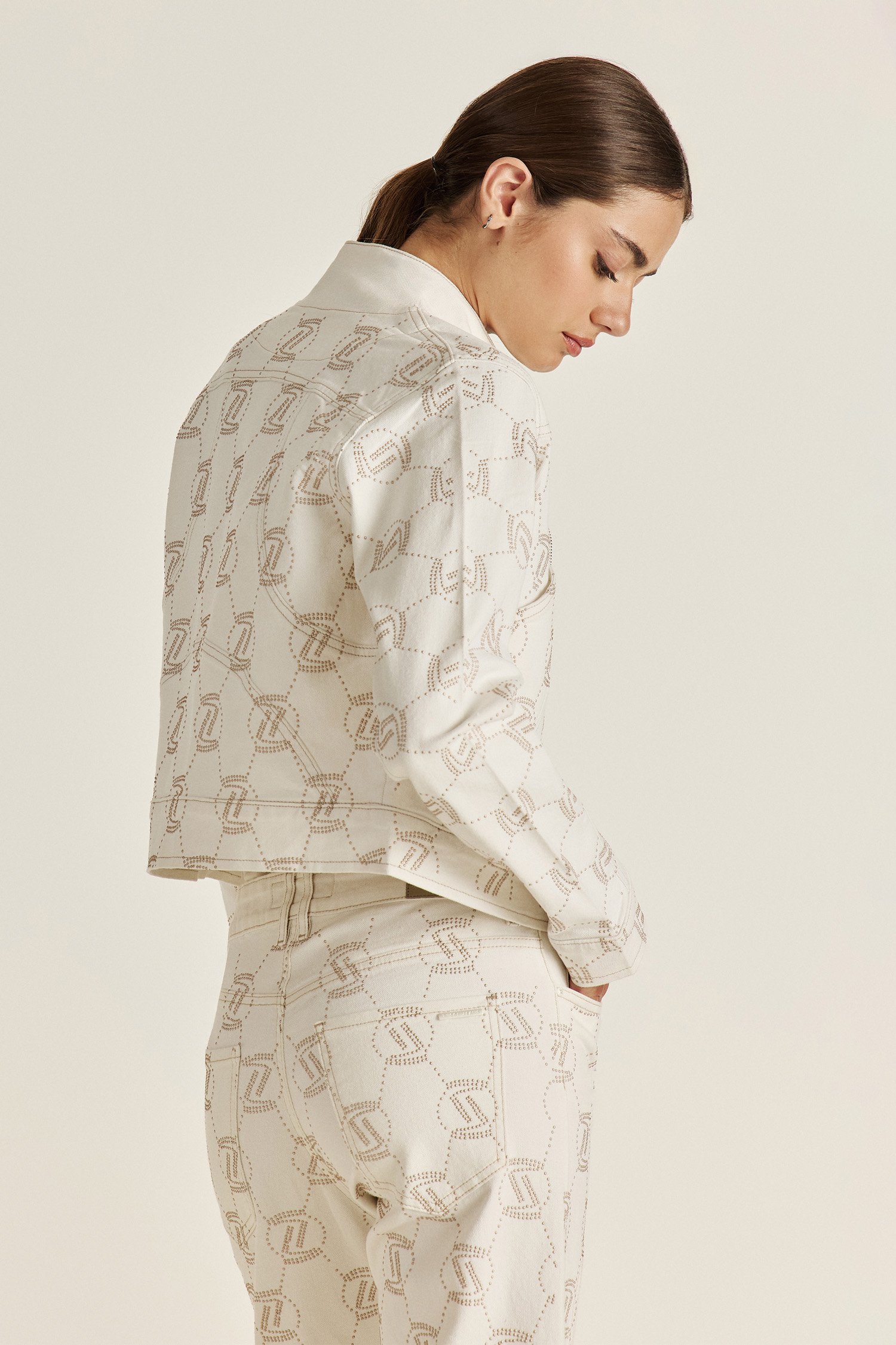 Campera de denim off white entallada con recortes en delantero y trasero confeccionada en tejido con stretch. Customizada full monogram con tachita bombé oro opaco. Combinala con el Pantalón Fancy Iconic.