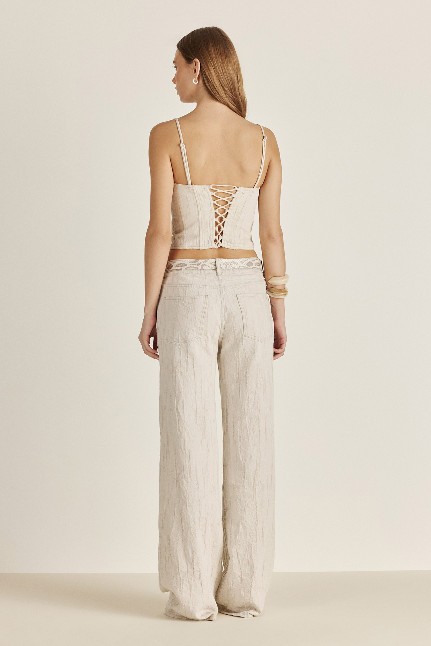 Top entallado color ecru con breteles regulables y espalda con elástico tubular al tono que permite adaptarse bien al cuerpo. Tejido 100% algodón importado de estructura jacquard desarrollado en exclusivo para la marca. Botones al tono. Combinalo con el Pant y Blazer Tulum.