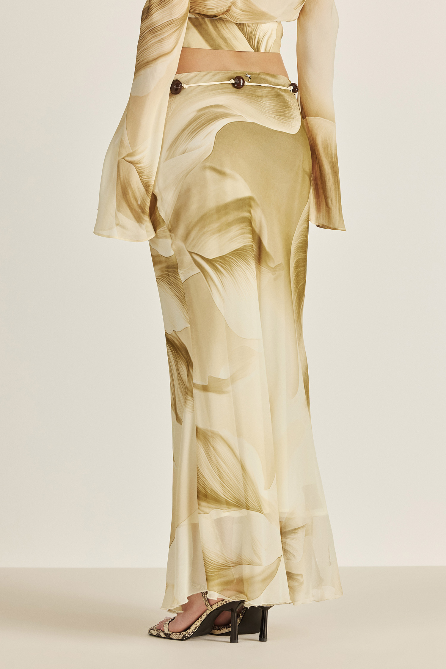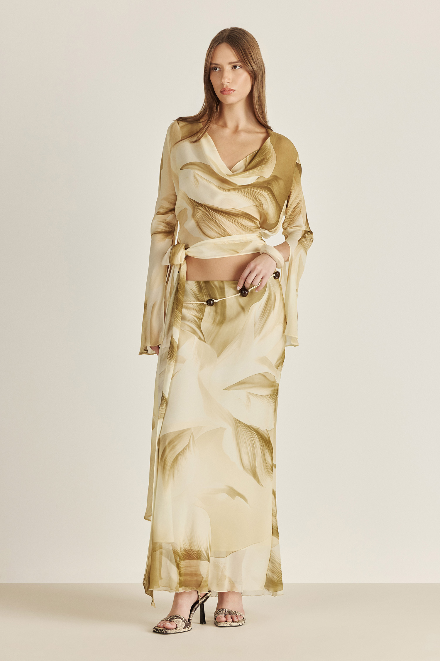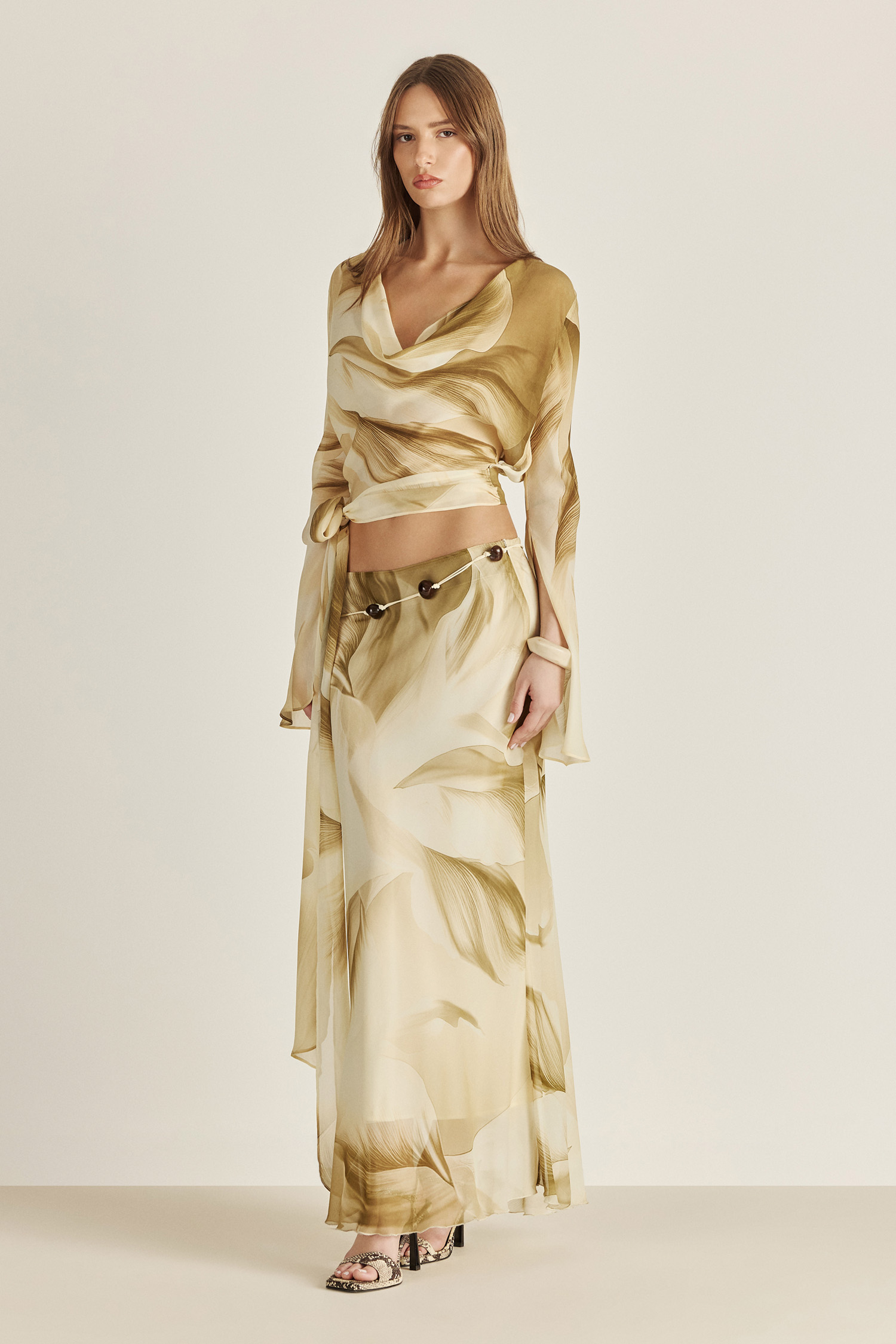 Falda larga de gasa liviana estampada con el print icónico de la temporada. Se corta al bies para lograr una silueta que se adapta suavemente al cuerpo y cae con fluidez. Es una opción ideal para un look veraniego con personalidad.