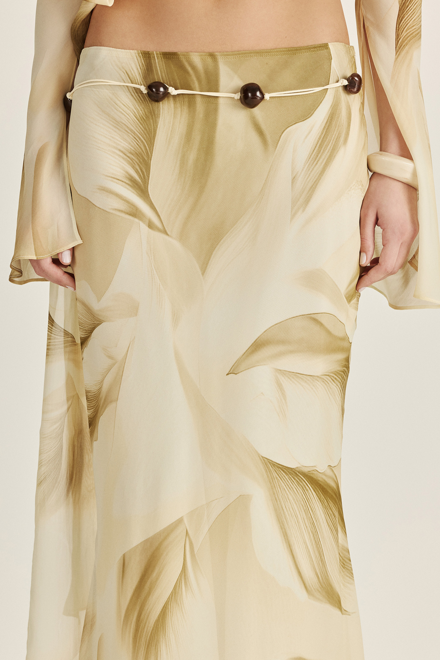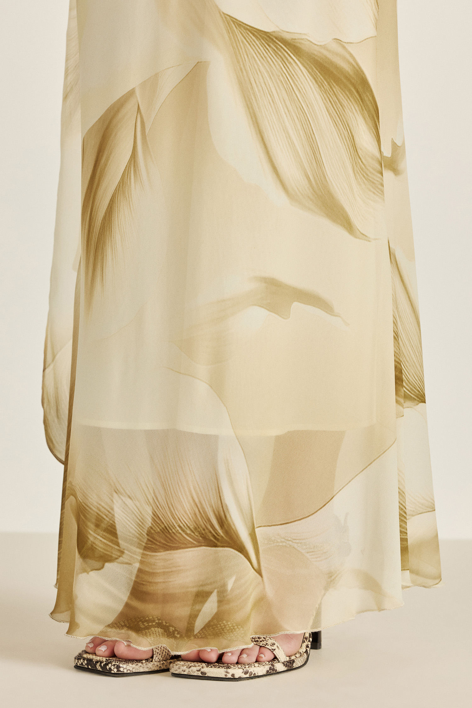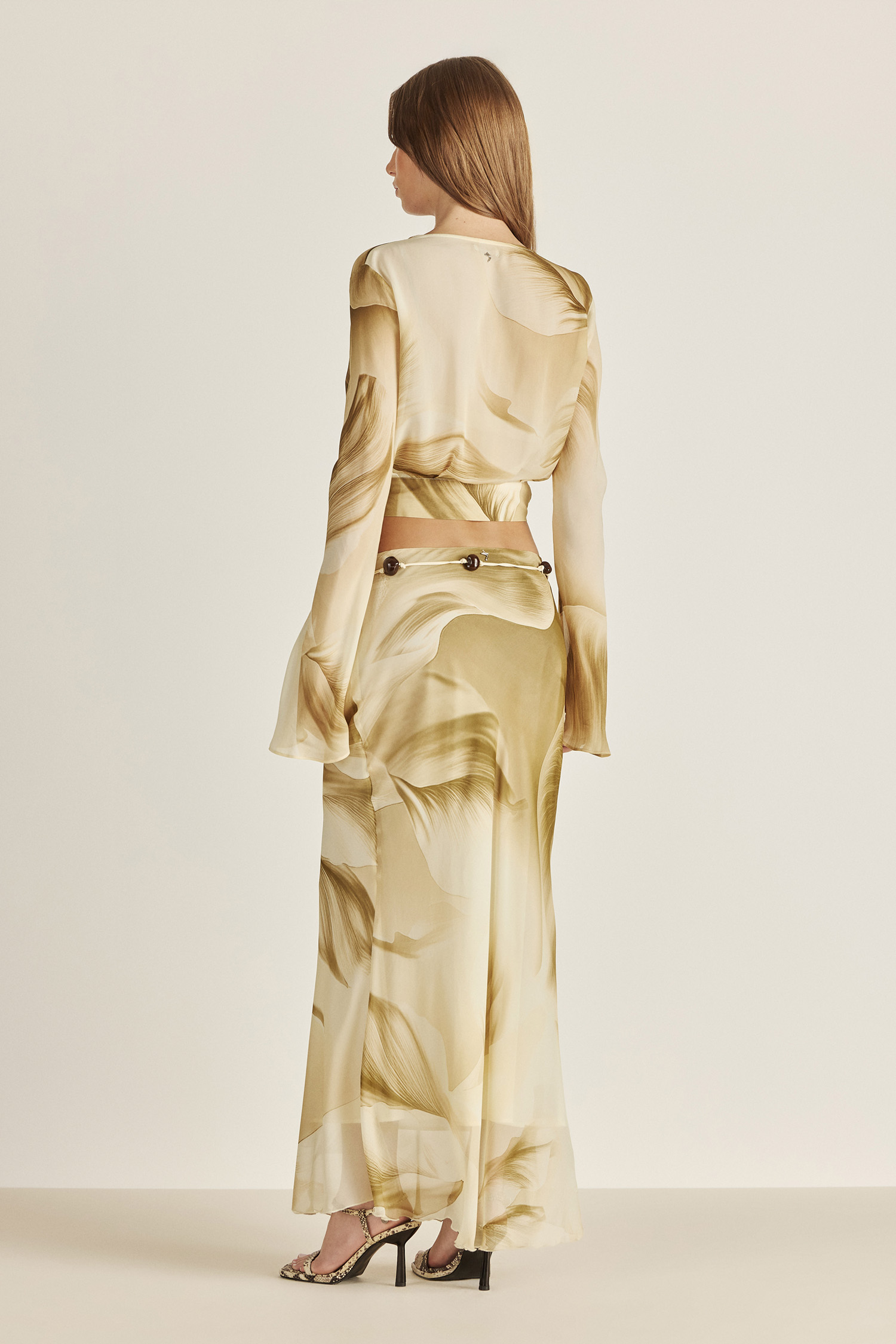 Falda larga de gasa liviana estampada con el print icónico de la temporada. Se corta al bies para lograr una silueta que se adapta suavemente al cuerpo y cae con fluidez. Es una opción ideal para un look veraniego con personalidad.
