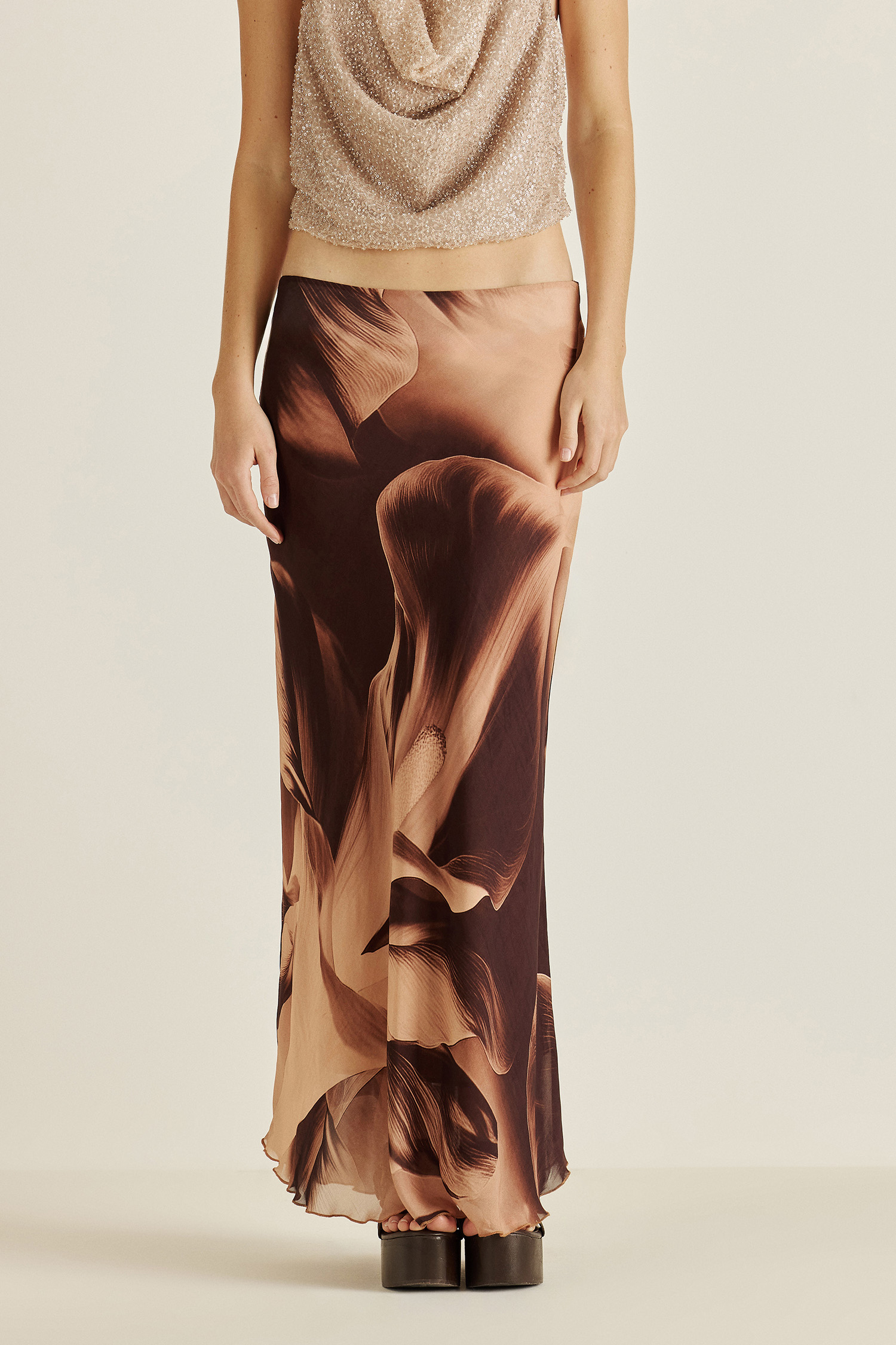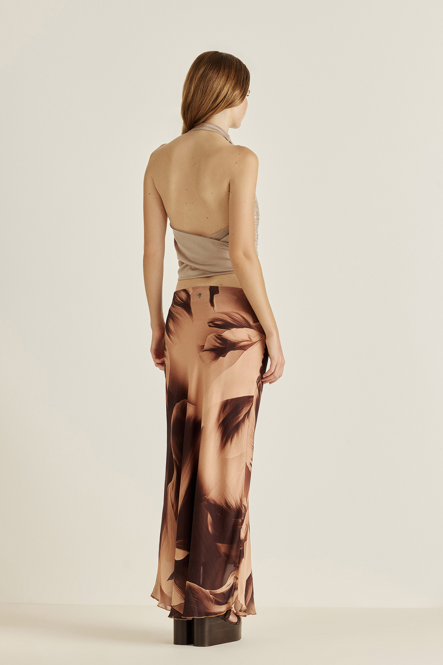 Falda larga de gasa liviana estampada con el print icónico de la temporada. Se corta al bies para lograr una silueta que se adapta suavemente al cuerpo y cae con fluidez. Es una opción ideal para un look veraniego con personalidad.