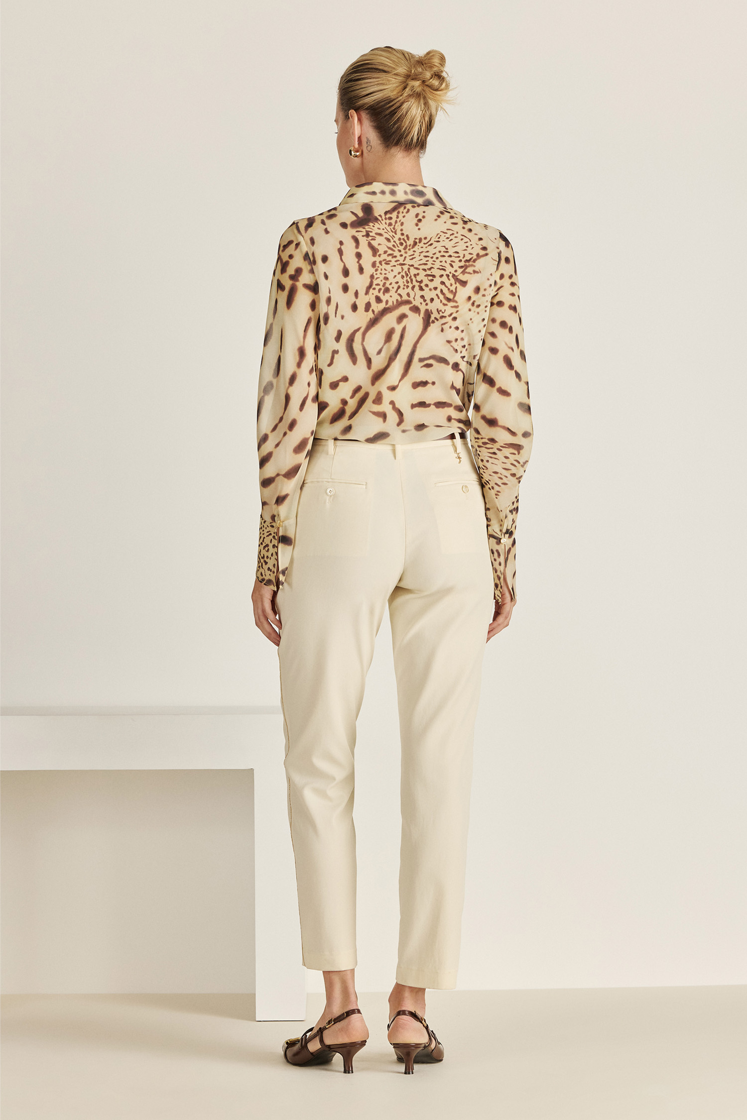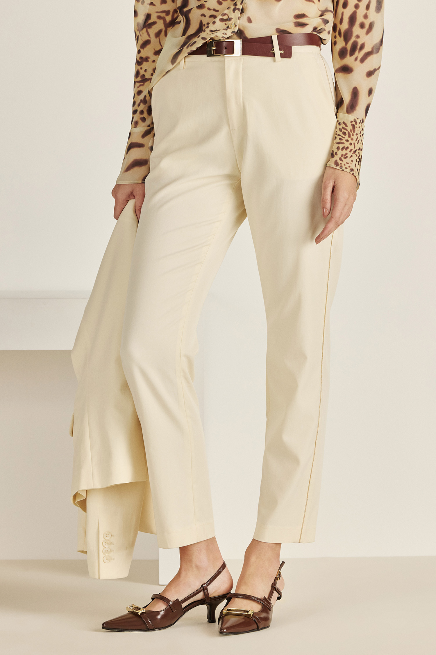 Pantalón sastrero con impronta femenina, el cual realza la figura con un calce impecable y suma el detalle distintivo del galón metálico, a juego con el saco Niza. Disponible en colores army y crudo, perfectos para la temporada.