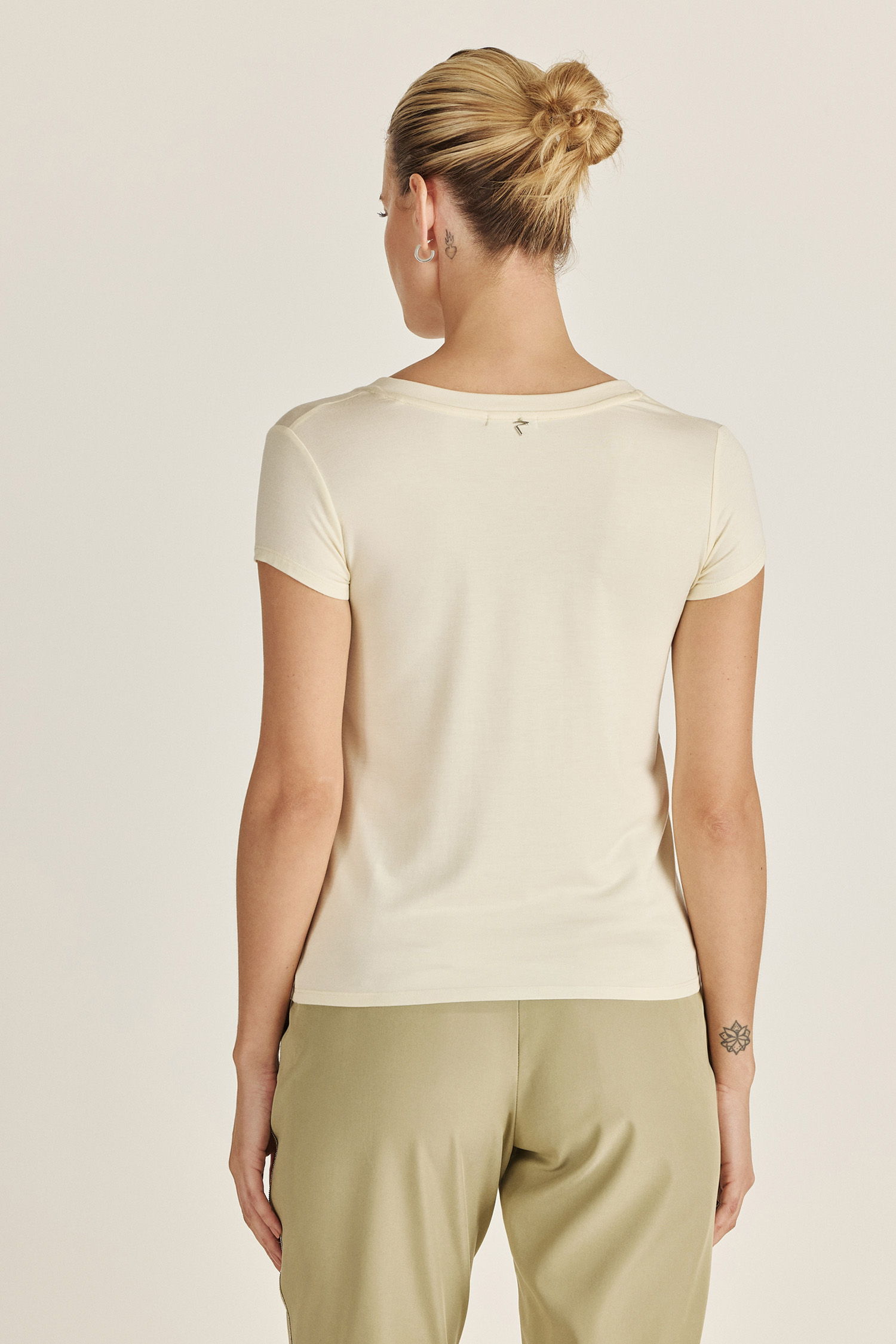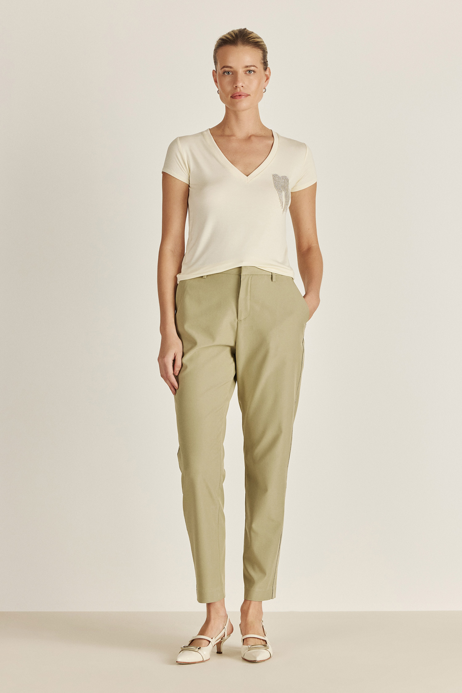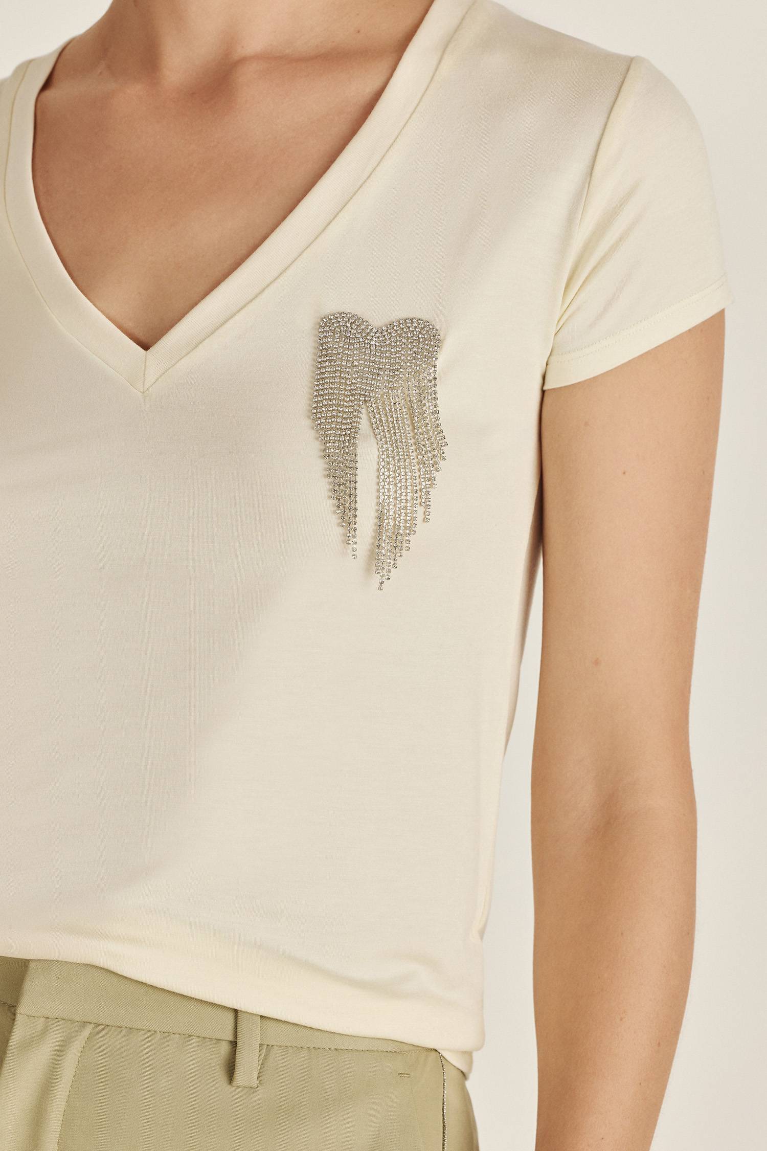 Remera confeccionada en género de punto liviano, con escote pronunciado y calce relajado. Un básico premium reversionado con un diseño de strass único en la colección, para elevar tus looks de día con mucha personalidad.