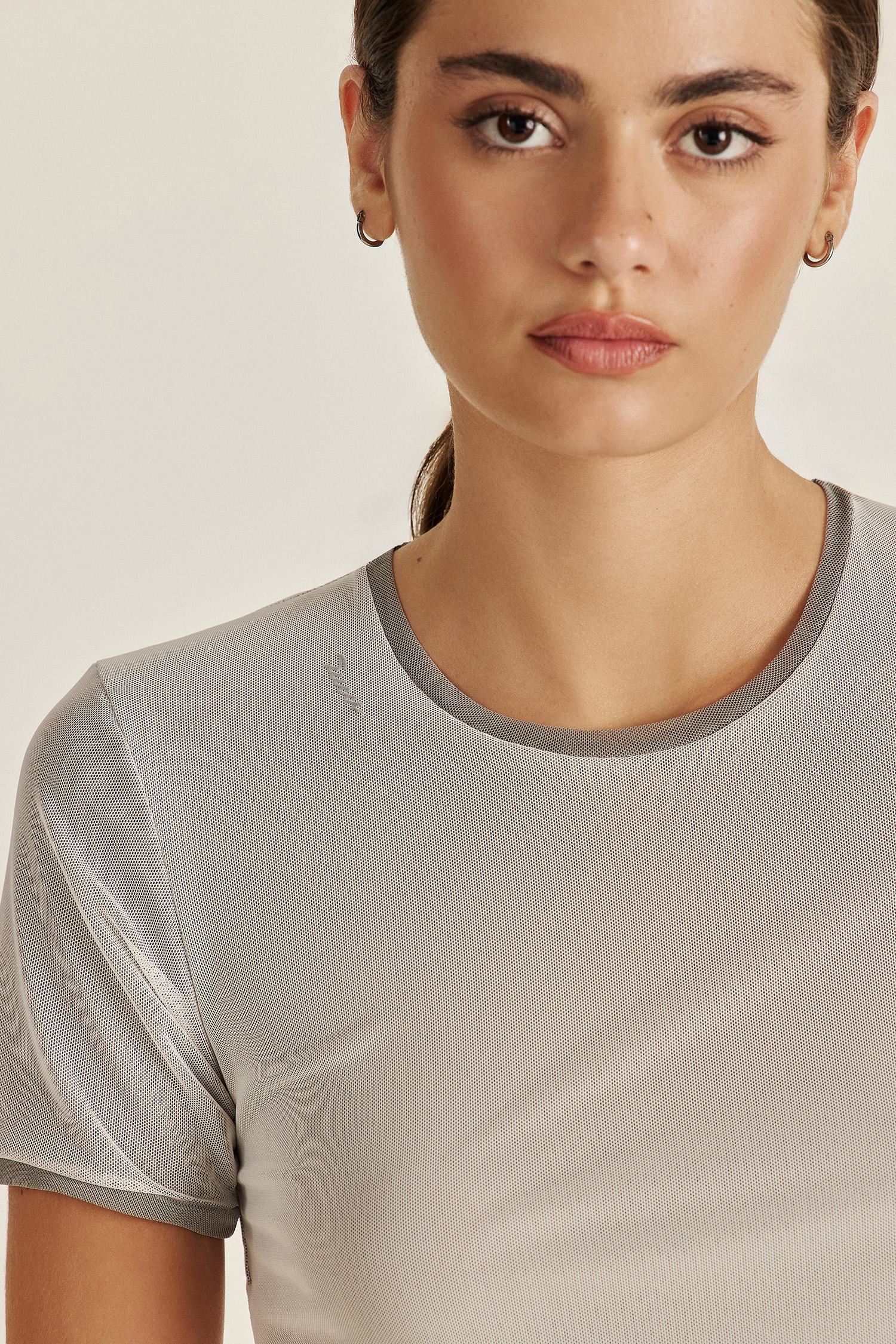 Remera confeccionada en género de punto translúcido, en su interior lleva el mismo tejido en un tono contrastante. En el escote, el logo cursiva con textura, aportando un detalle distintivo que realza la prenda de forma sutil.