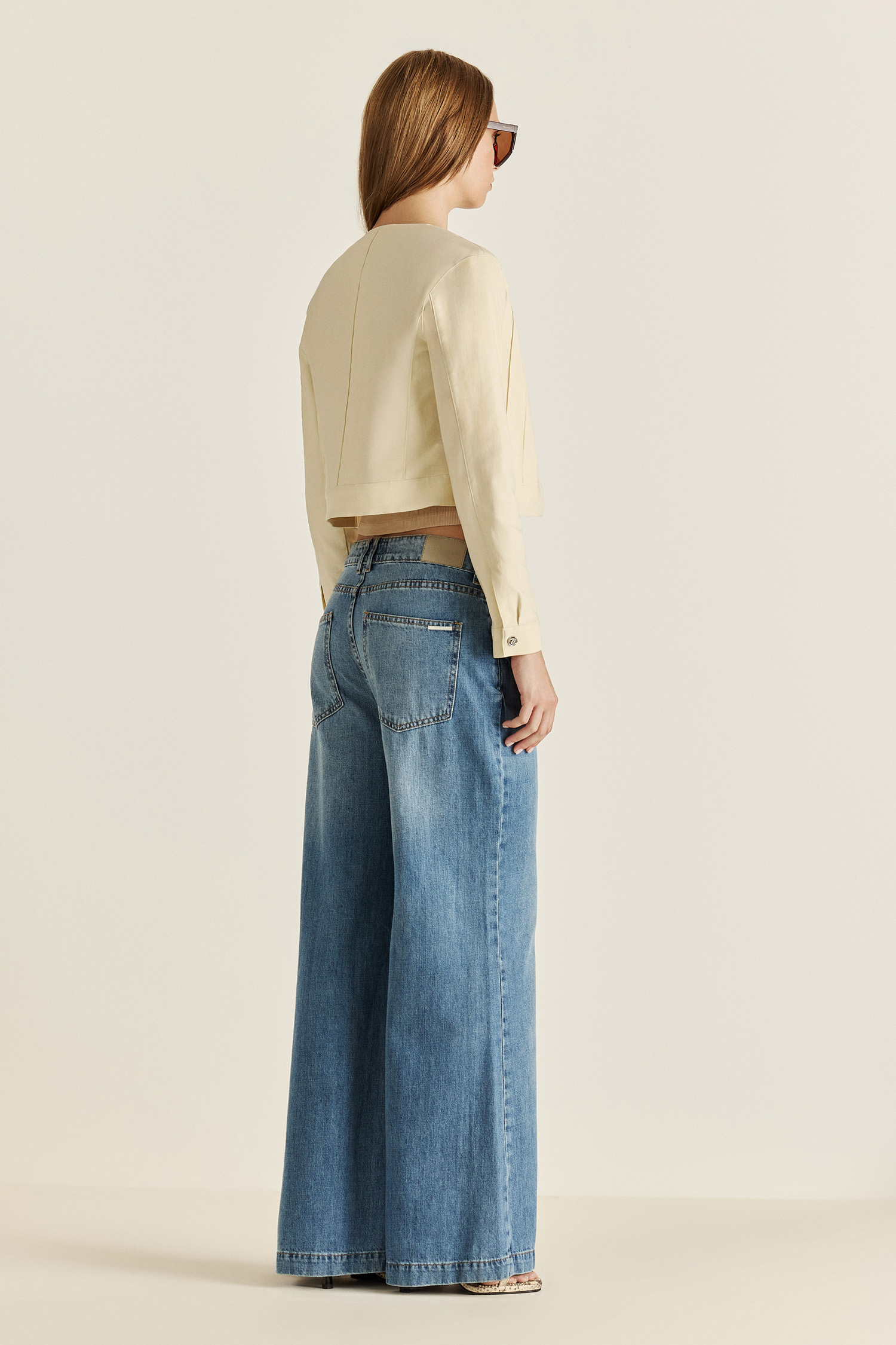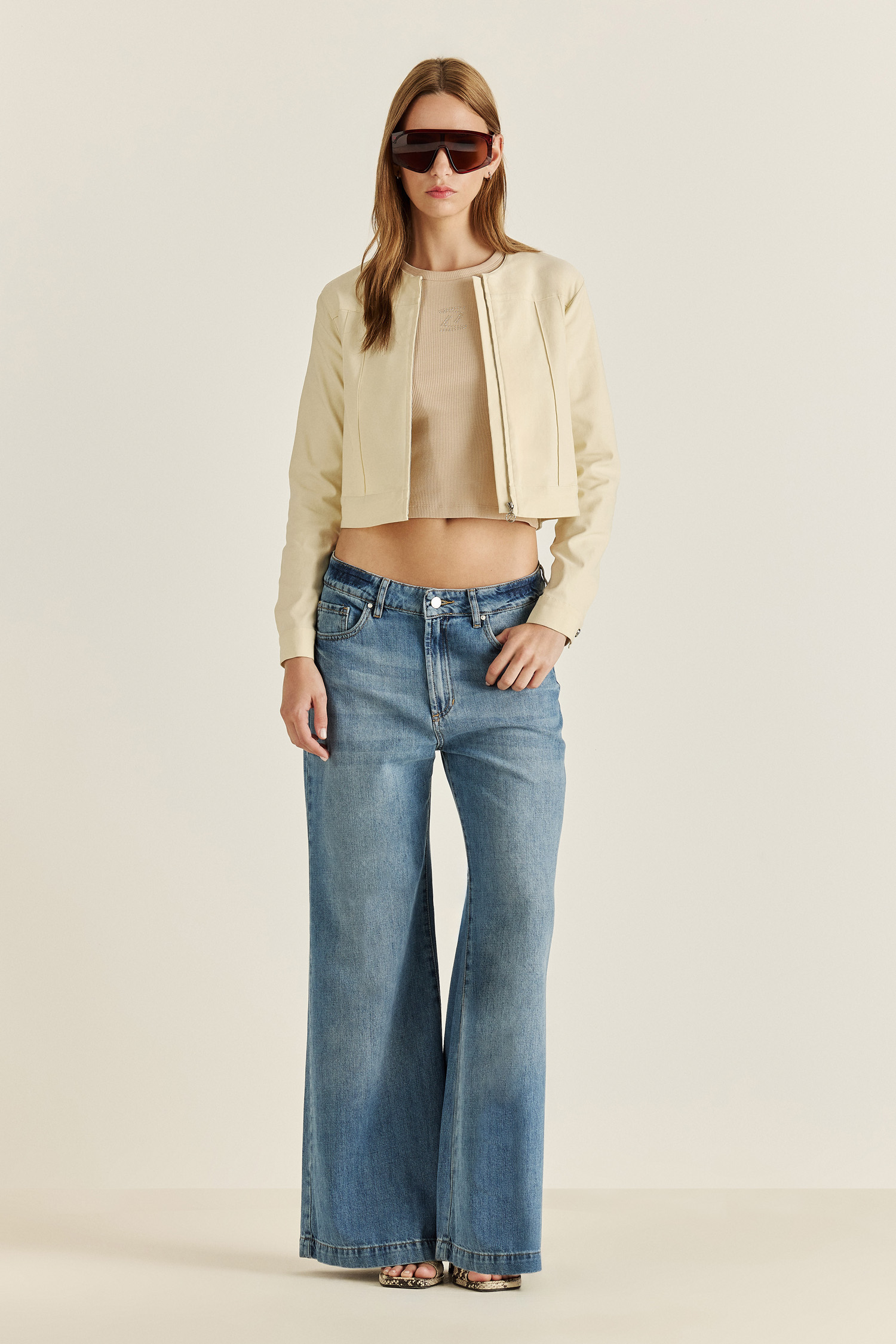 Con un diseño moderno y canchero, esta chaqueta se destaca por su estructura impecable y detalles de alforzas. Versátil y con mucha actitud, es el complemento ideal para elevar cualquier look.