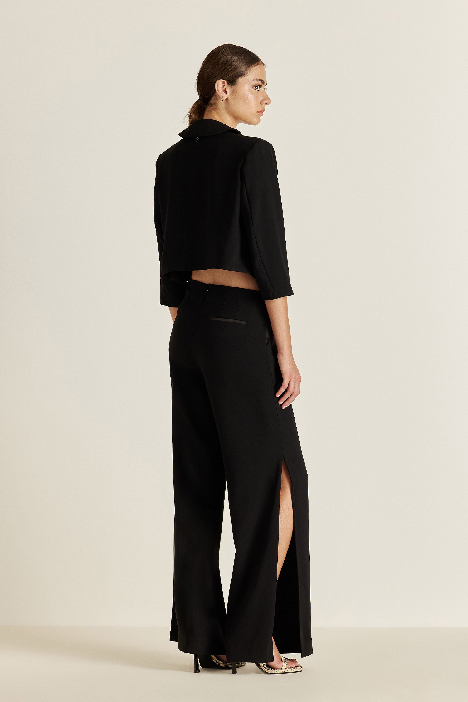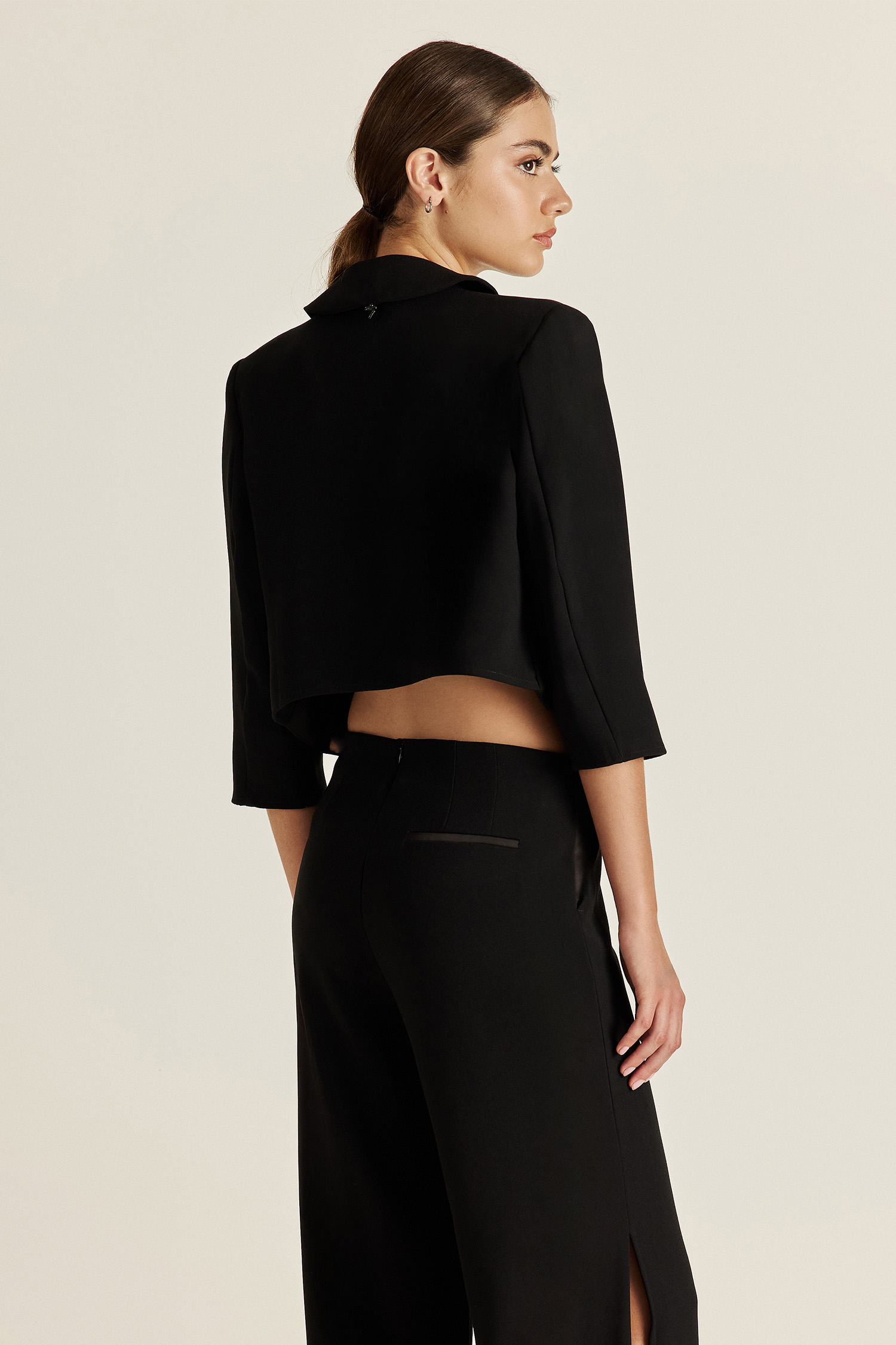 Confeccionada en crepé de alta calidad. Esta chaqueta lleva combinación de tela satén en las solapas, aportando elegancia a la prenda. De caída fluida y estilo relajado, es el toque final perfecto para elevar cualquier conjunto