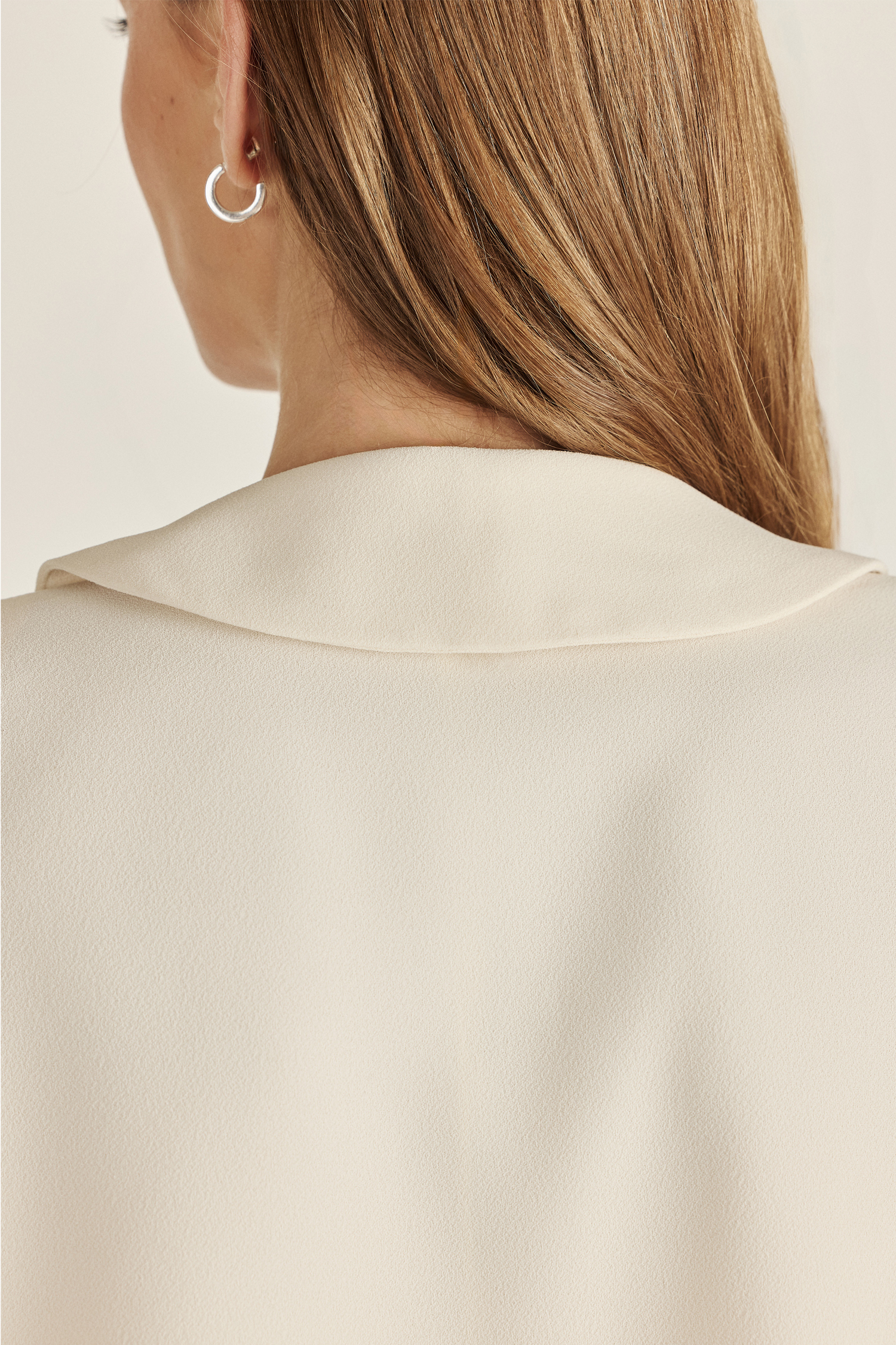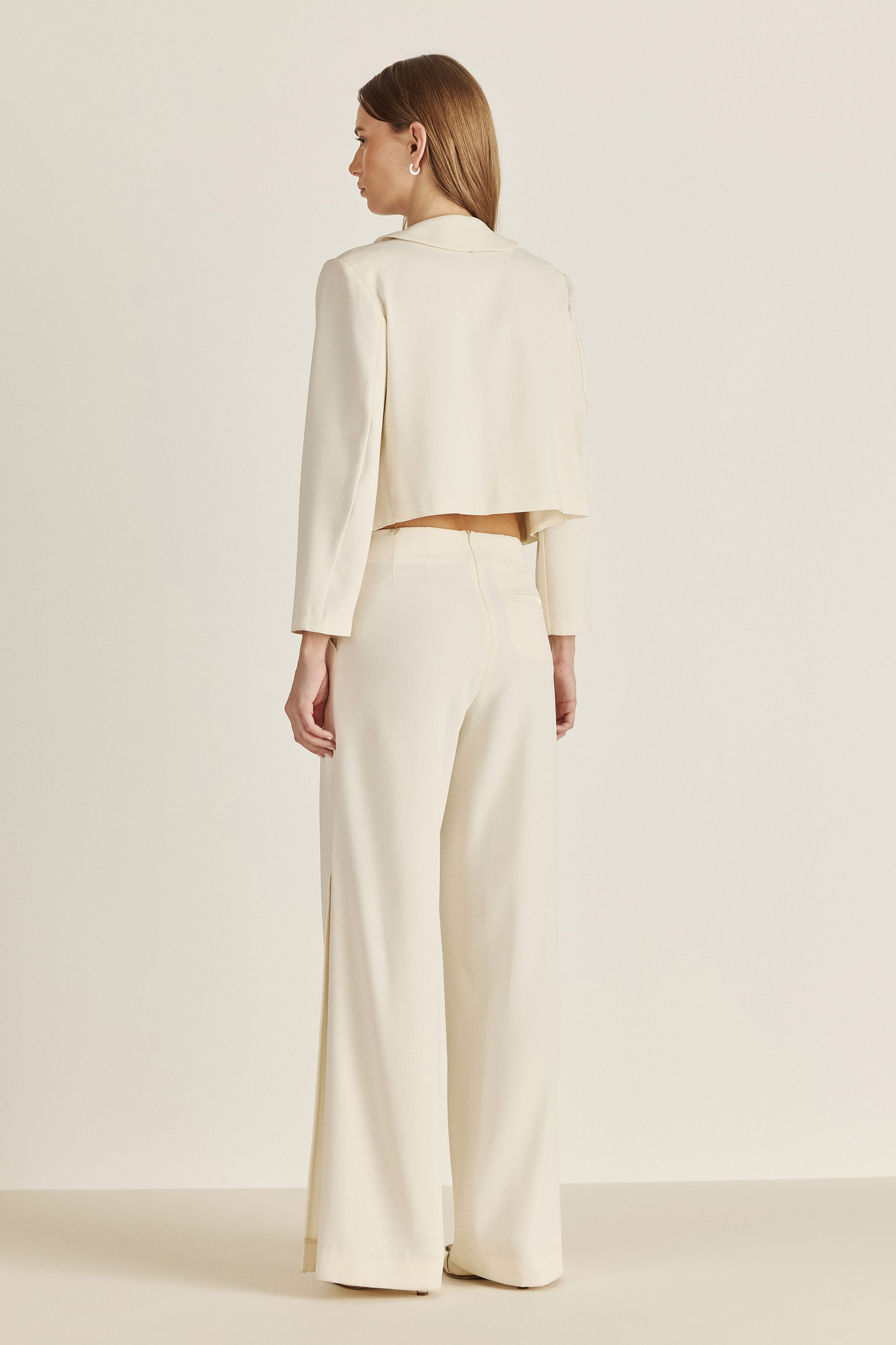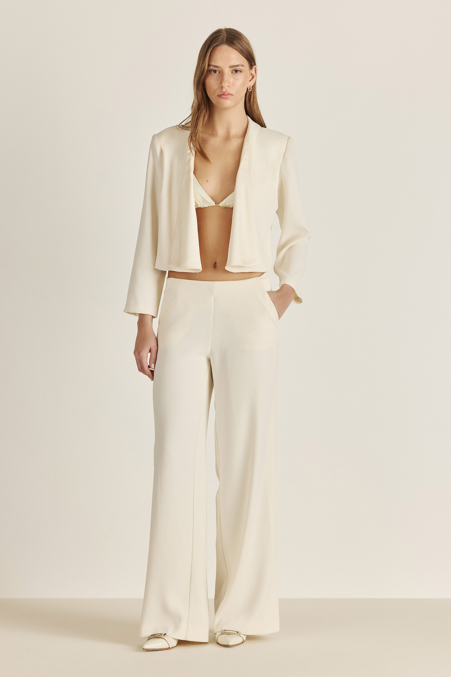 Confeccionada en crepé de alta calidad. Esta chaqueta lleva combinación de tela satén en las solapas, aportando elegancia a la prenda. De caída fluida y estilo relajado, es el toque final perfecto para elevar cualquier conjunto