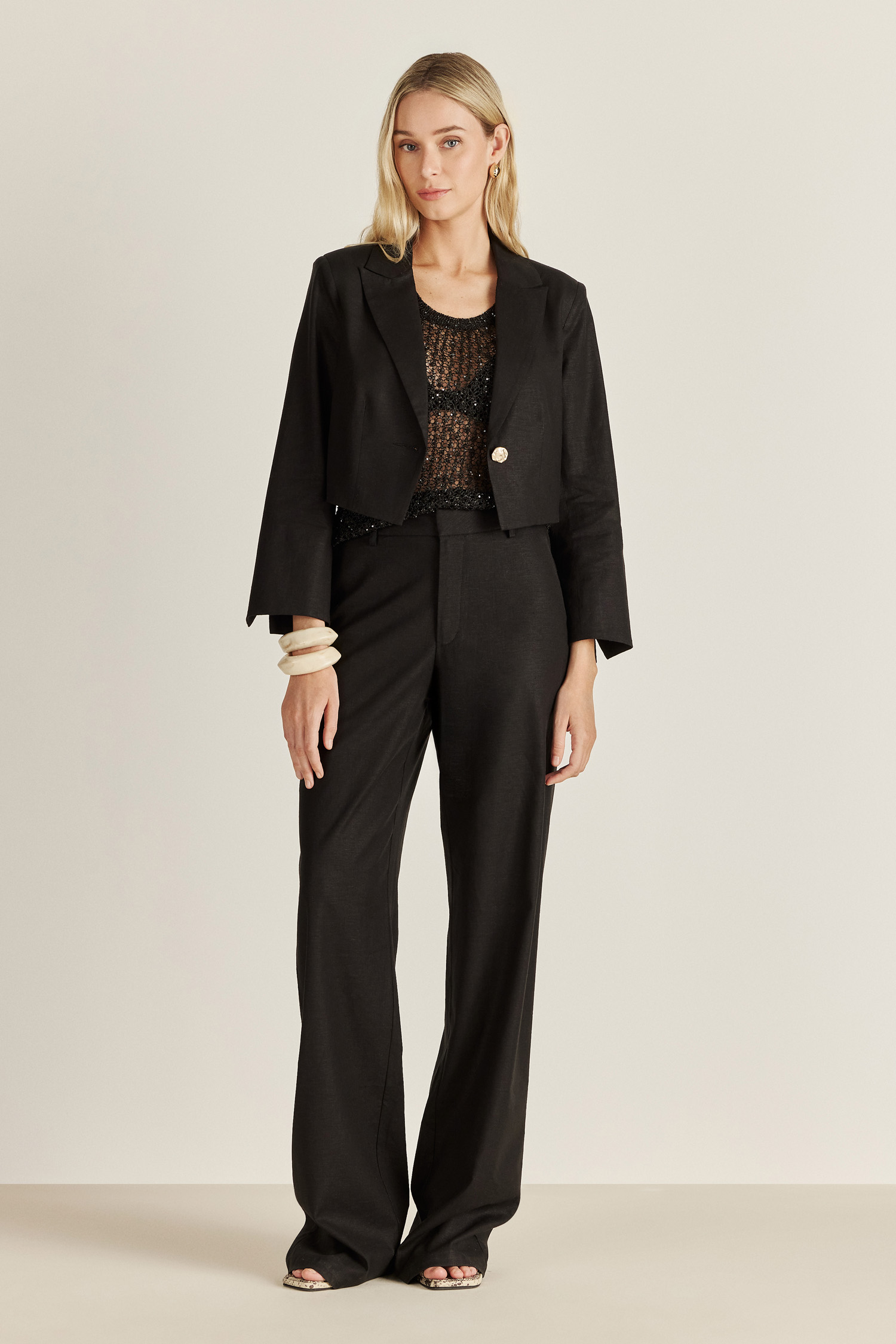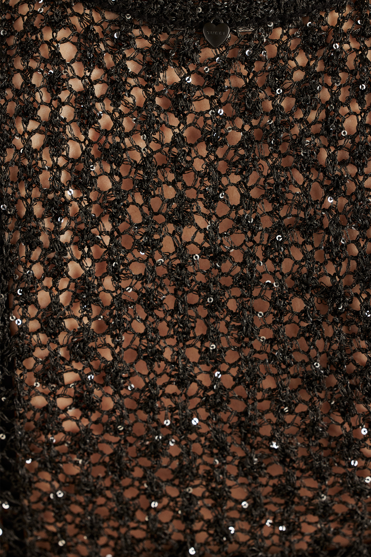 De tejido con lentejuelas, el Top Midnight se destaca por su sensualidad ya que genera transparencias. Es de escote pronunciado y lleva un dije metálico personalizado Tucci en la espalda, ideal para quienes desean llevar un look que habla por sí solo.