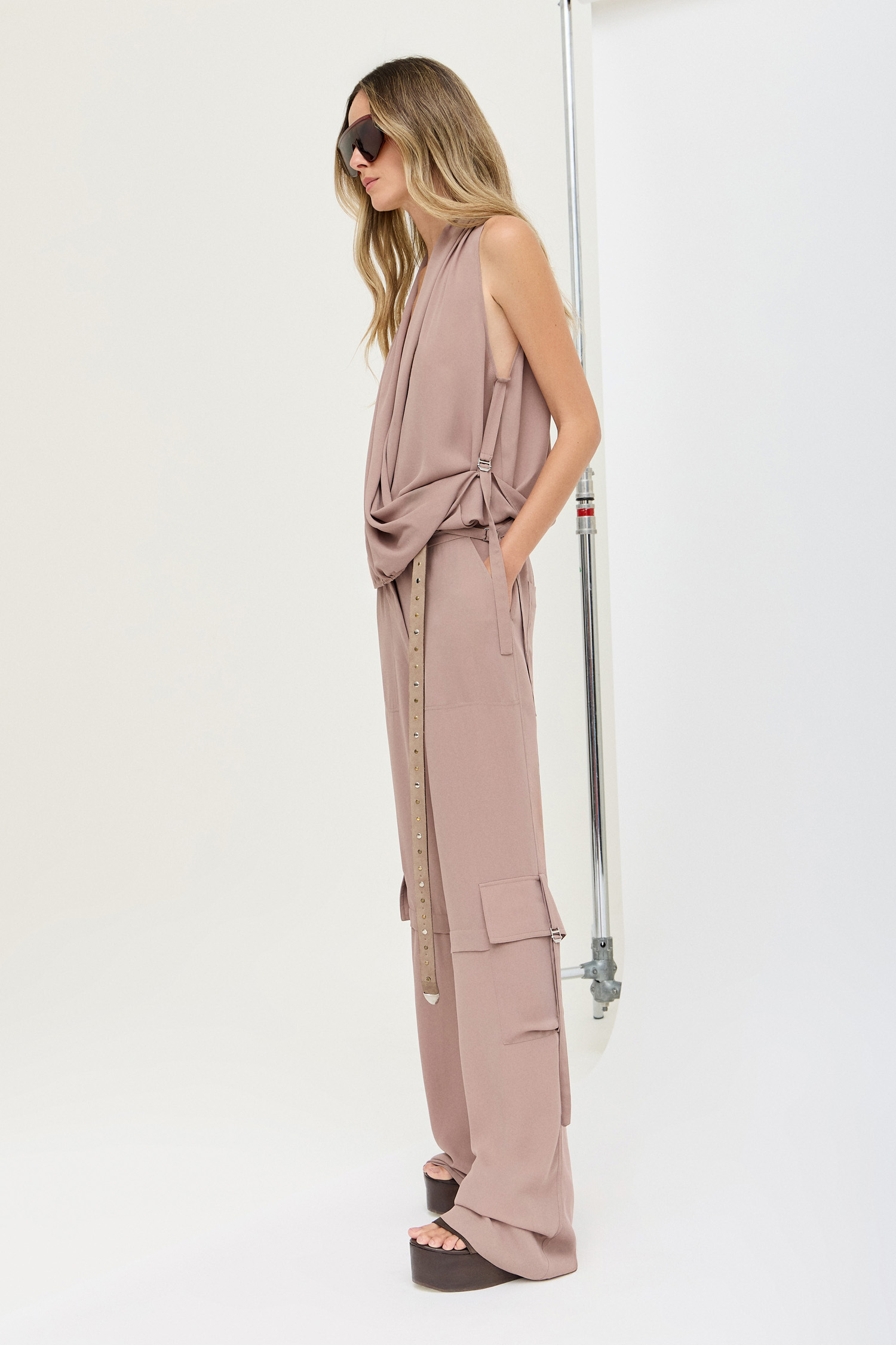 Confeccionado con un género liviano y fluido, este top tiene un escote drapeado que genera un look distintivo. Podés regularlo de un lateral para acortarlo a tu gusto. Usalo con el Pantalón Leia para un total look con mucho estilo.
