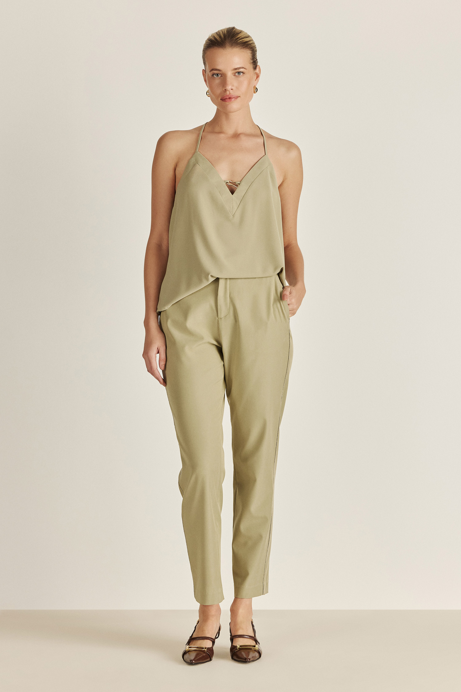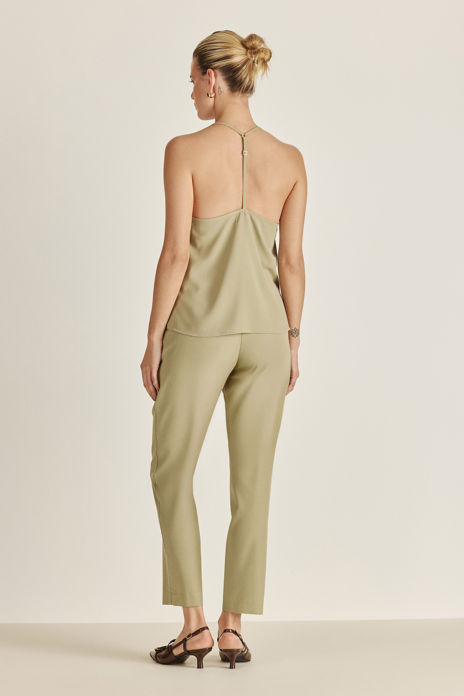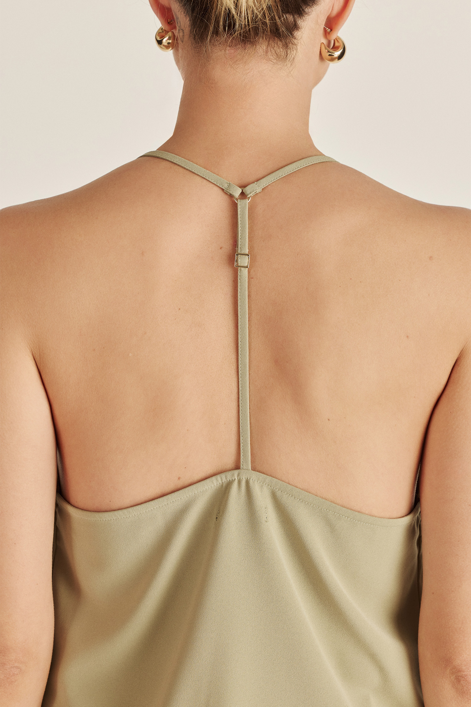 Top confeccionado con género fluido, tiene una silueta relajada y espalda baja. Versátil y lleno de estilo, lleva un avío metálico con diseño exclusivo de la temporada de Verano 26.