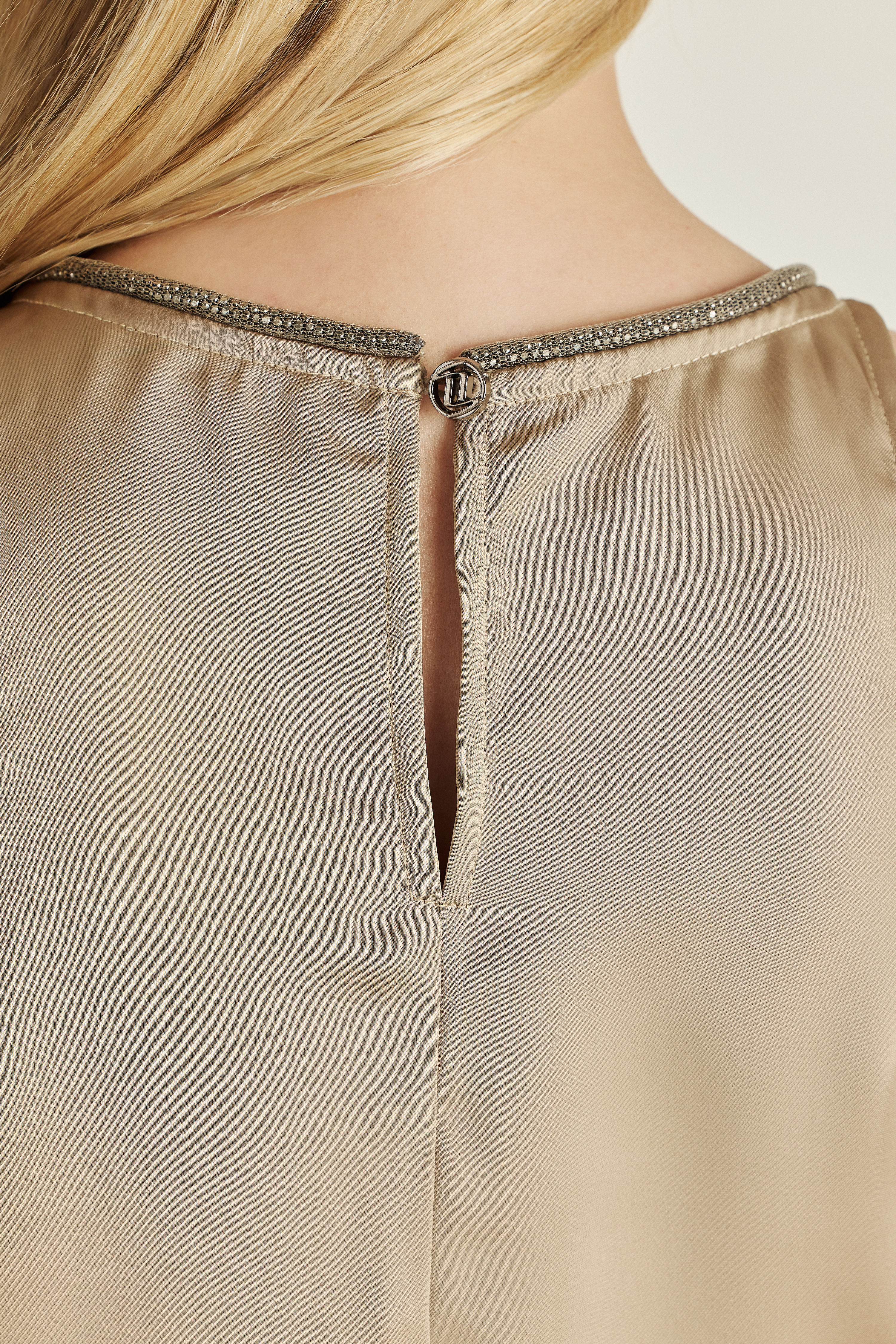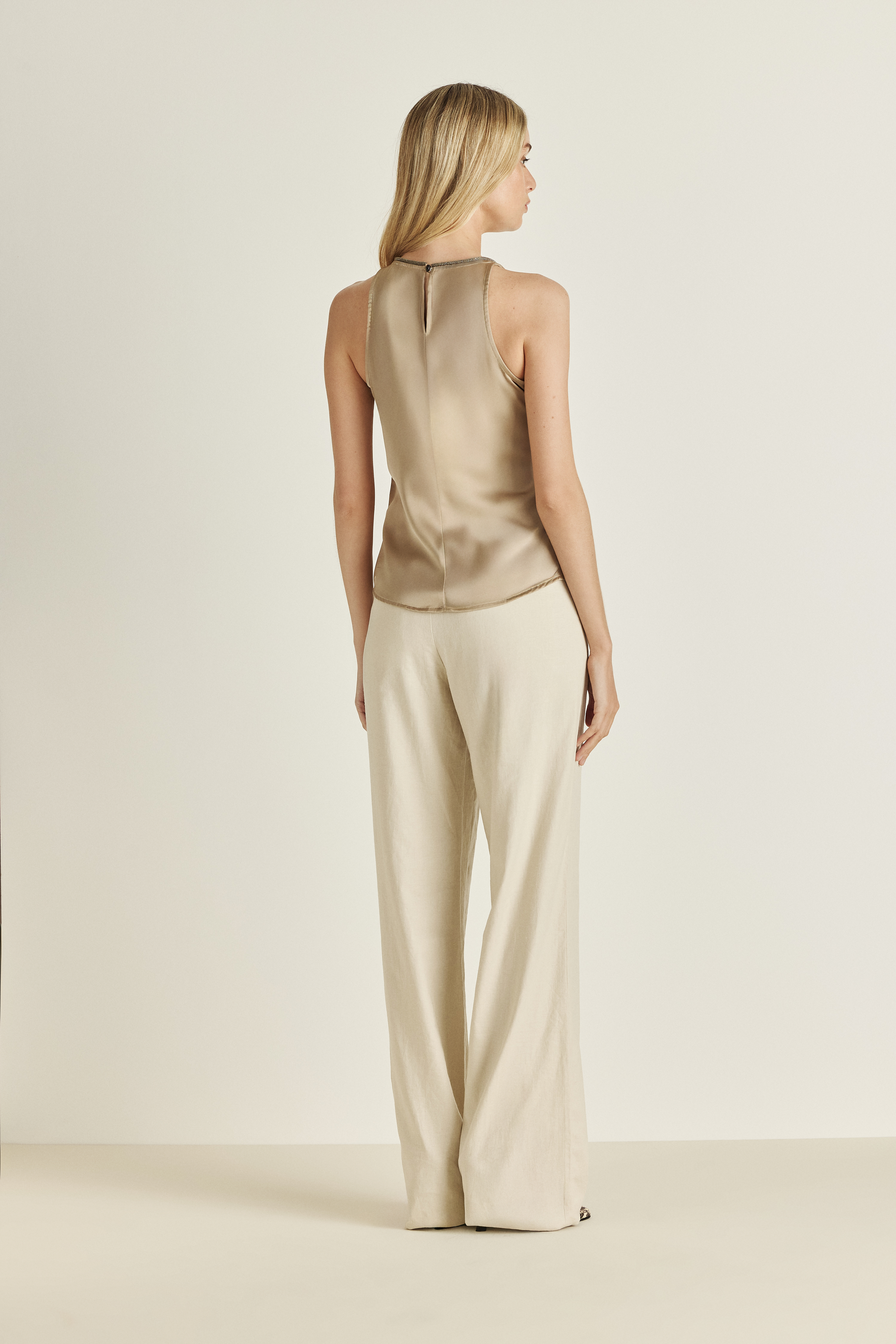 Este top sin mangas, confeccionado en satén suave, potencia tu look con un delicado galón de strass en el escote y las sisas. Ideal para darle brillo a tus outfits de noche o de día.