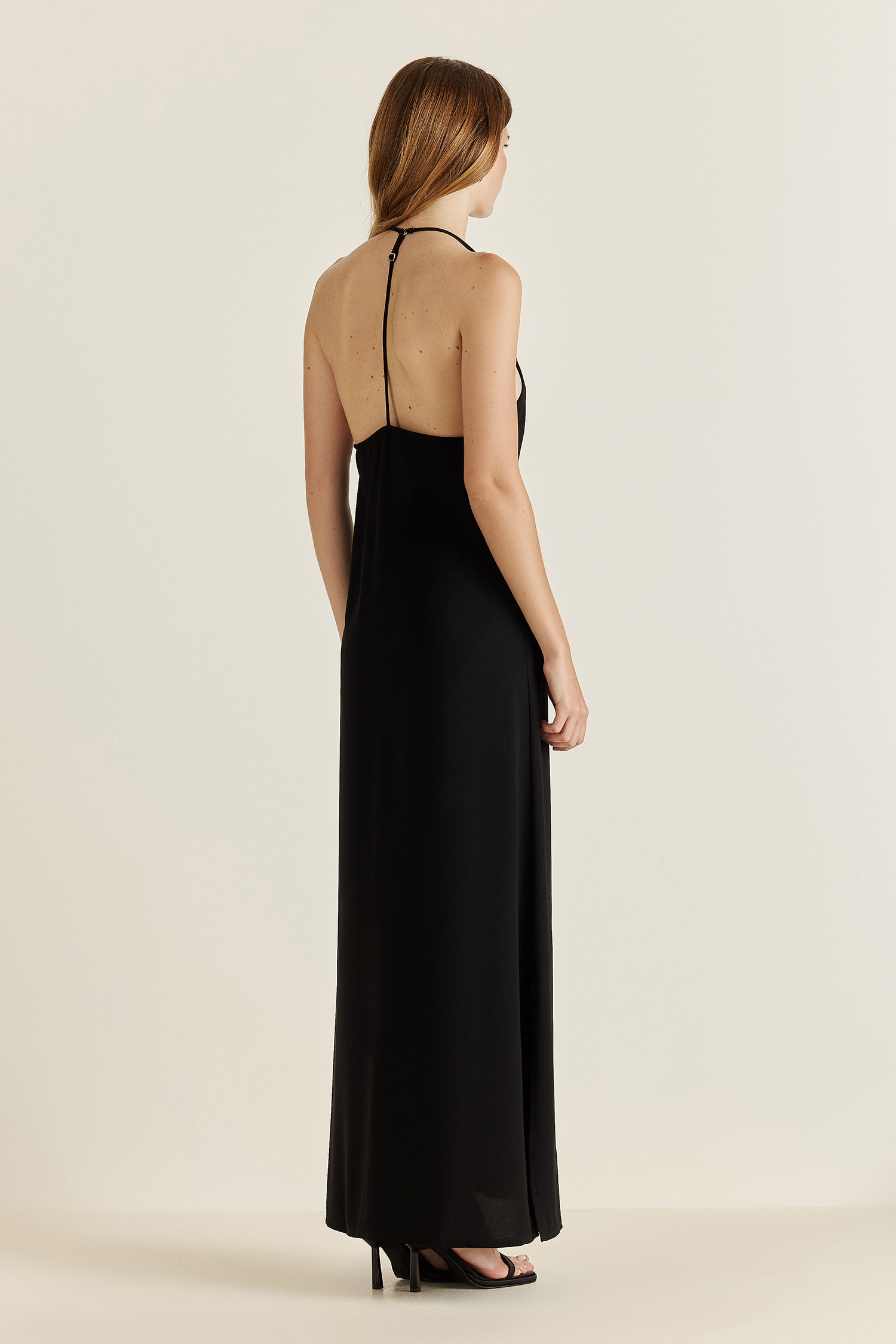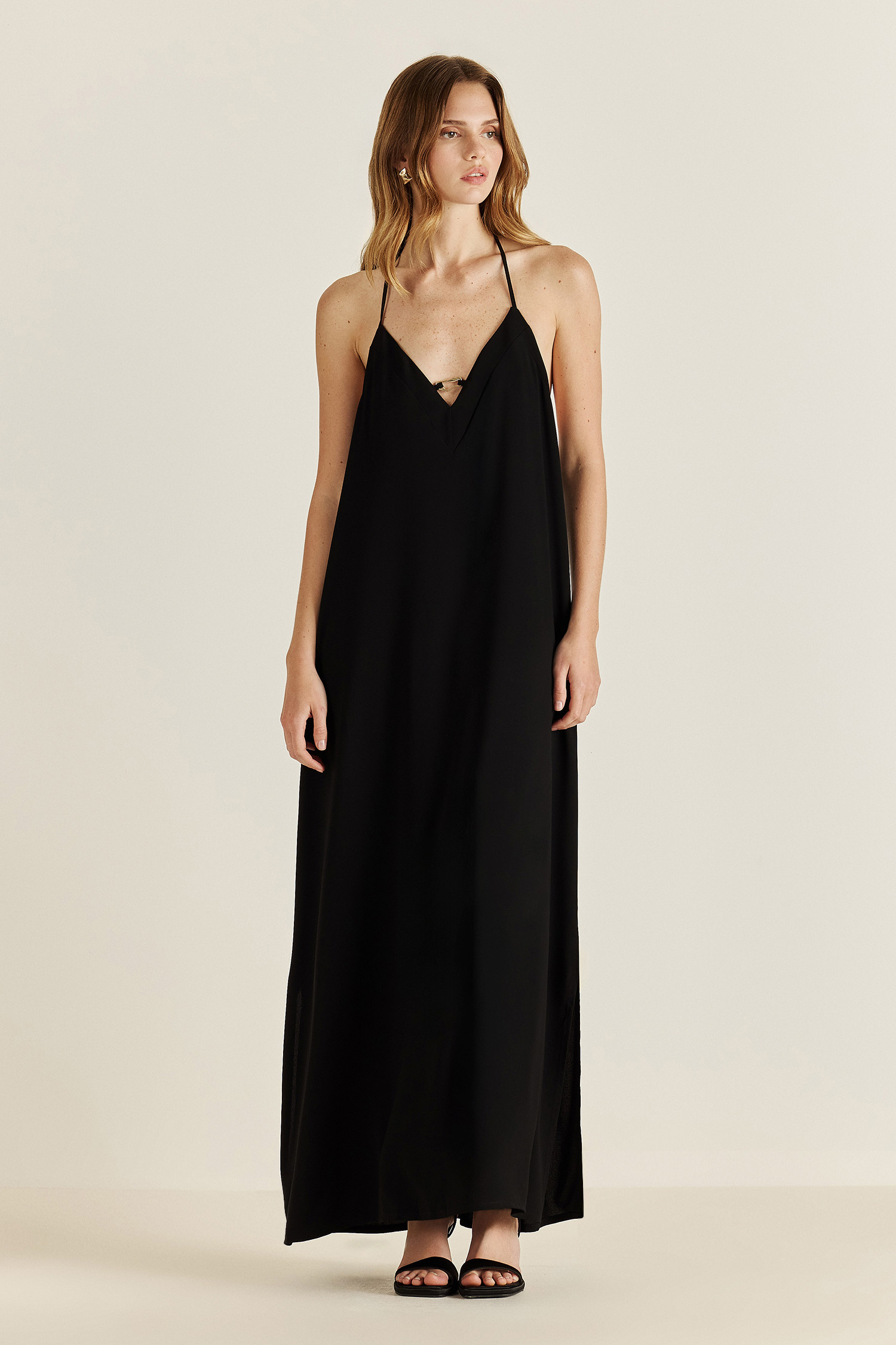 Vestido confeccionado con género fluido, tiene una silueta relajada y escote pronunciado baja para que dejes ver tu sensualidad. Versátil y lleno de estilo, lleva un avío metálico con diseño exclusivo de la temporada de Verano 26.