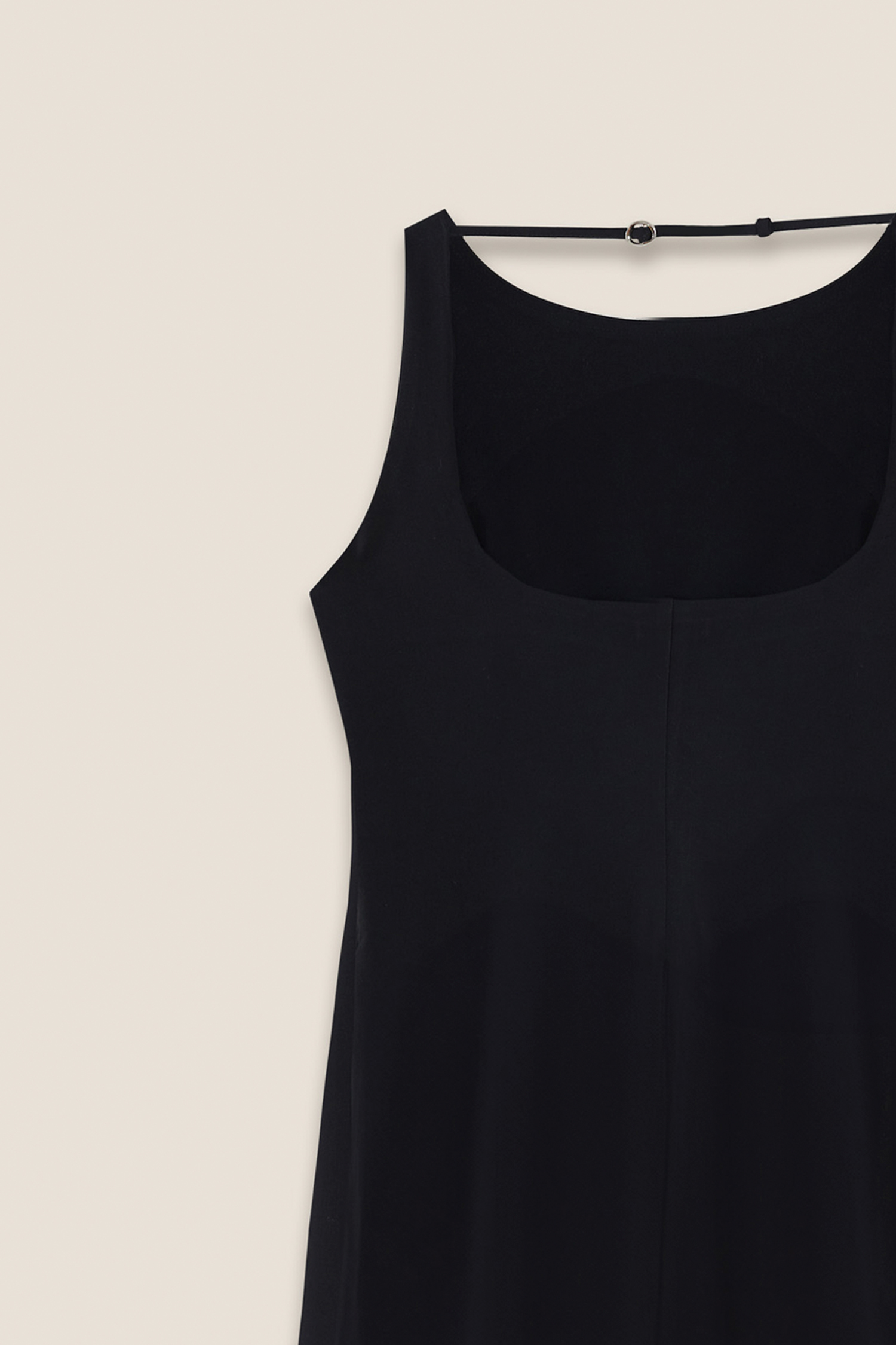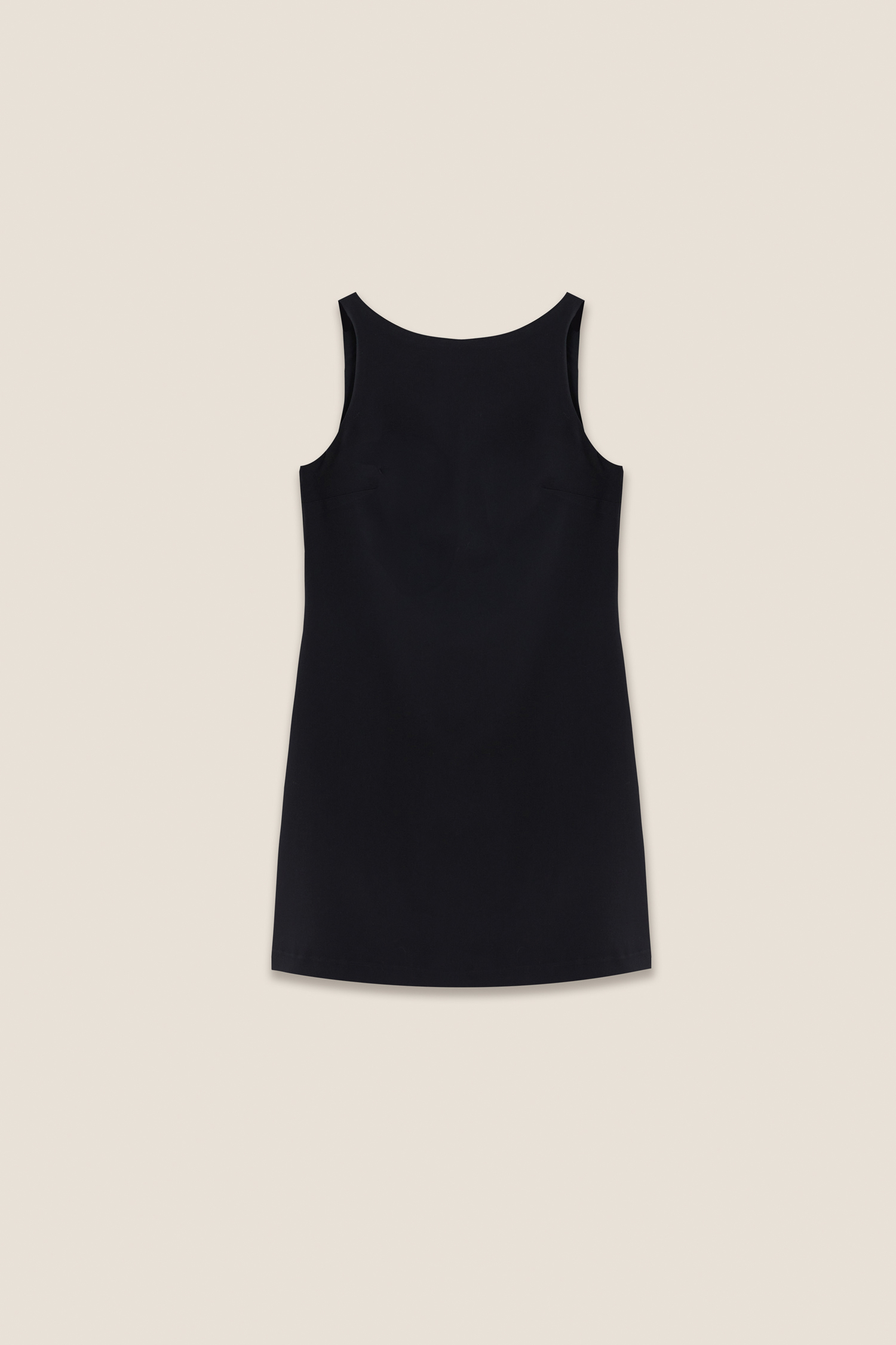 Vestido confeccionado en sastrero liviano. En la espalda, lleva pasador metálico exclusivo Tucci, que permite ajustar la prenda a tu gusto.