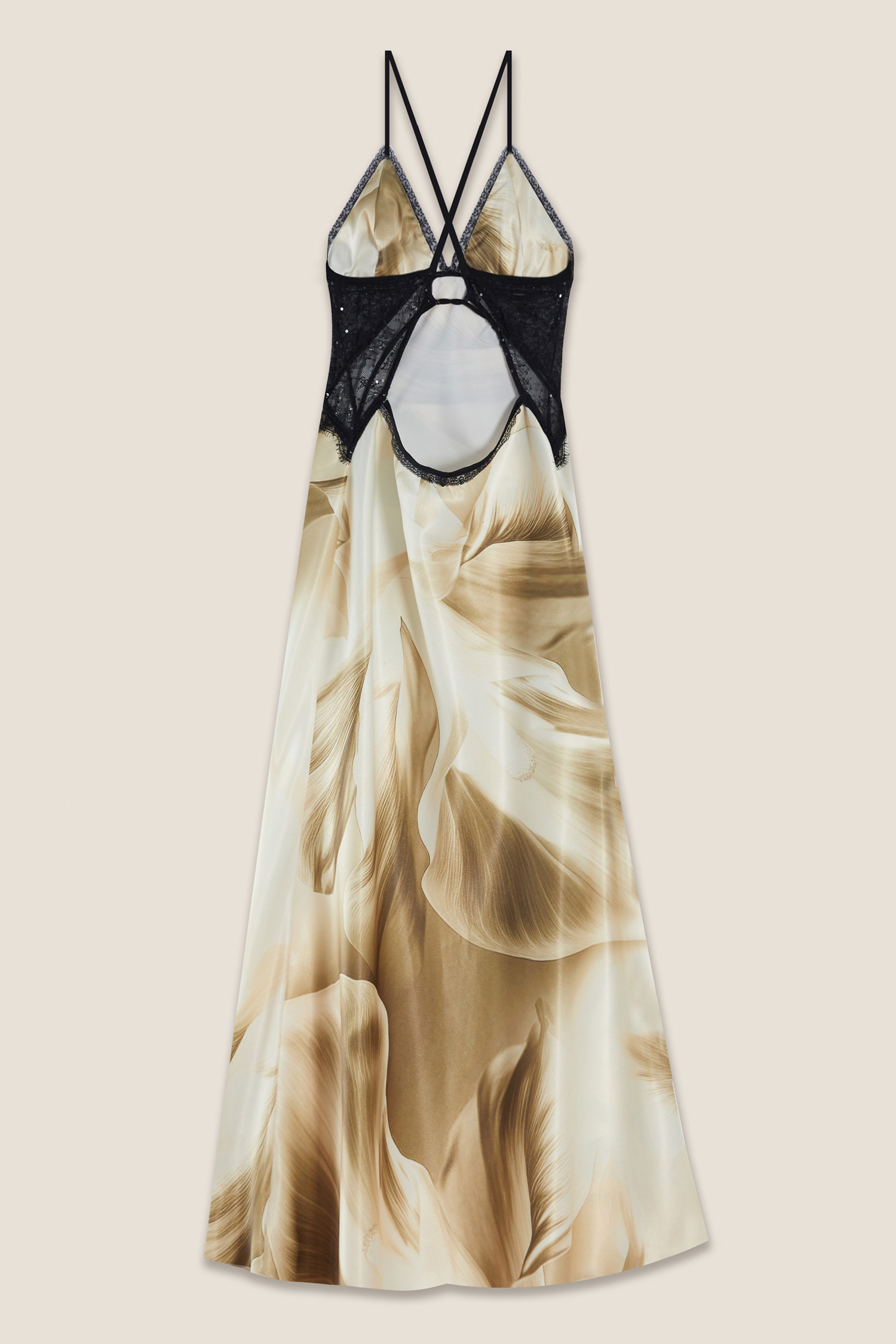 Vestido confeccionado en género satinado con destellos y una estampa exclusiva que refleja el espíritu vibrante del verano, se combina con encaje bordado en lentejuelas y puntillas a contratono, ubicadas en recortes que realzan la silueta. Un diseño pensado para que te sientas #MuyTucci.