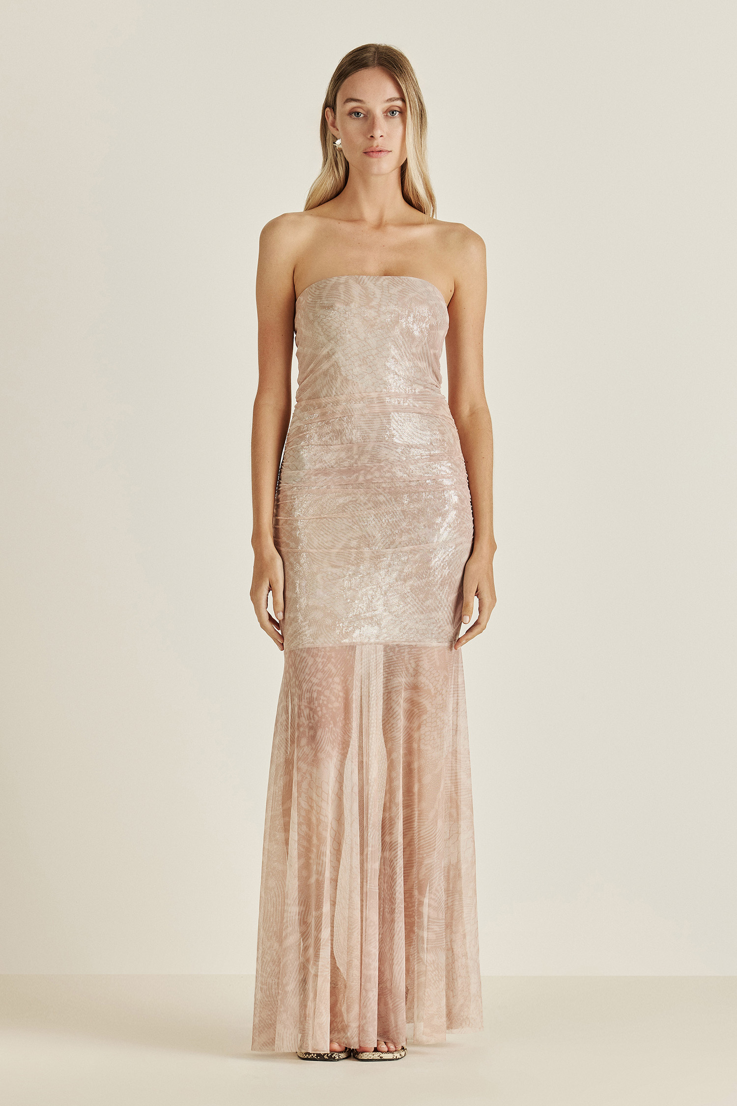 Confeccionado en un textil de lentejuelas que moldea, define y realza la silueta, este vestido es una de las piezas más icónicas de la colección Tucci Night. Incorpora un body interno que garantiza comodidad y seguridad en cada movimiento. El tajo delantero y el escote fueron diseñados en equilibrio perfecto para lograr una silueta sexy, elegante y auténticamente Tucci.