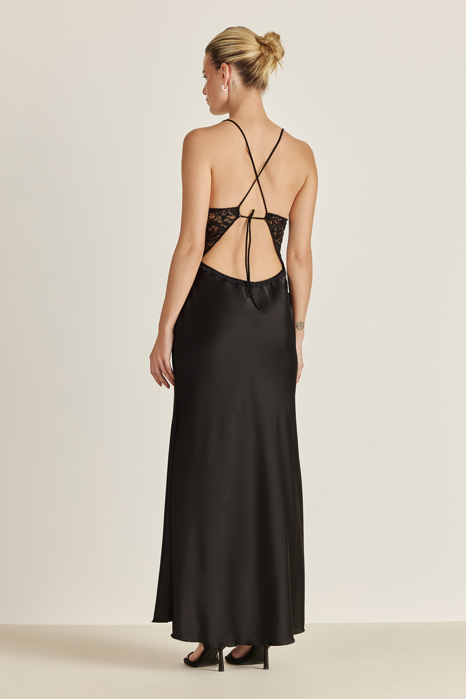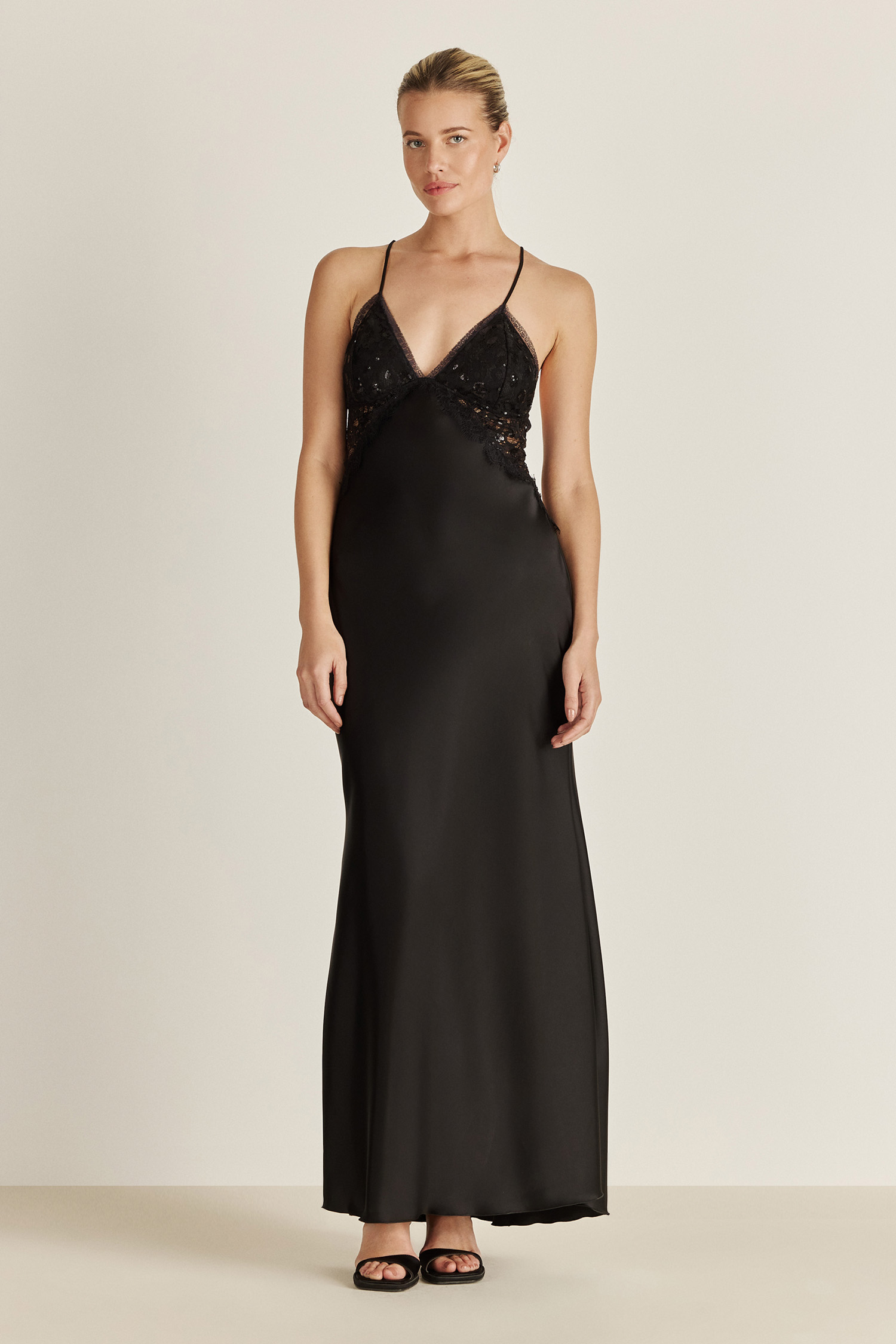 Vestido confeccionado en género satinado pesado, en combinacion con encaje bordado con lentejuelas y puntillas. En la espalda lleva breteles que permiten regular y ajustar la prenda al cuerpo. Un iconic look temporada tras temporada para lucir #MuyTucci